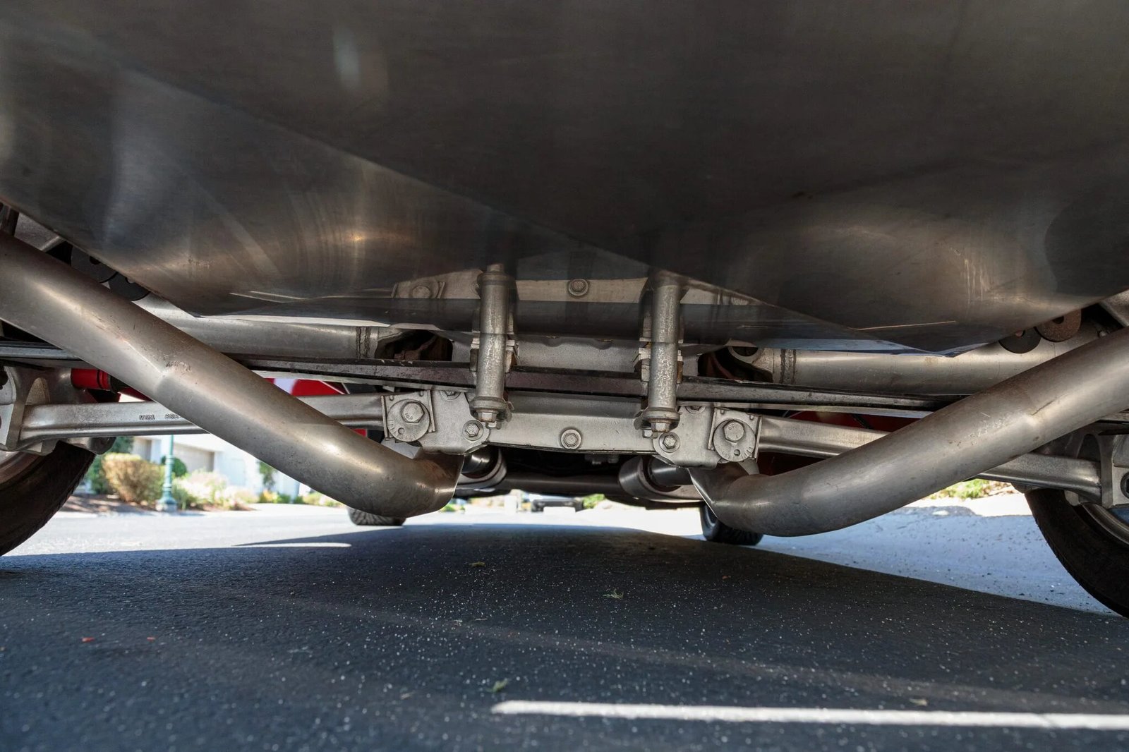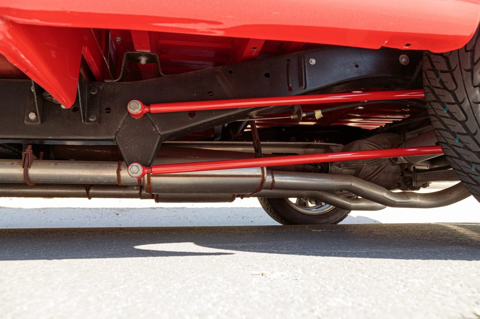 Modifications include front and rear sway bars, a lowered suspension, a steering stabilizer, a C4 Corvette-sourced limited-slip rear end, and power-assisted disc brakes at all four corners.