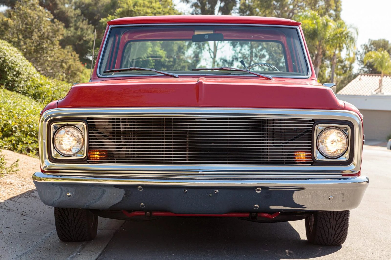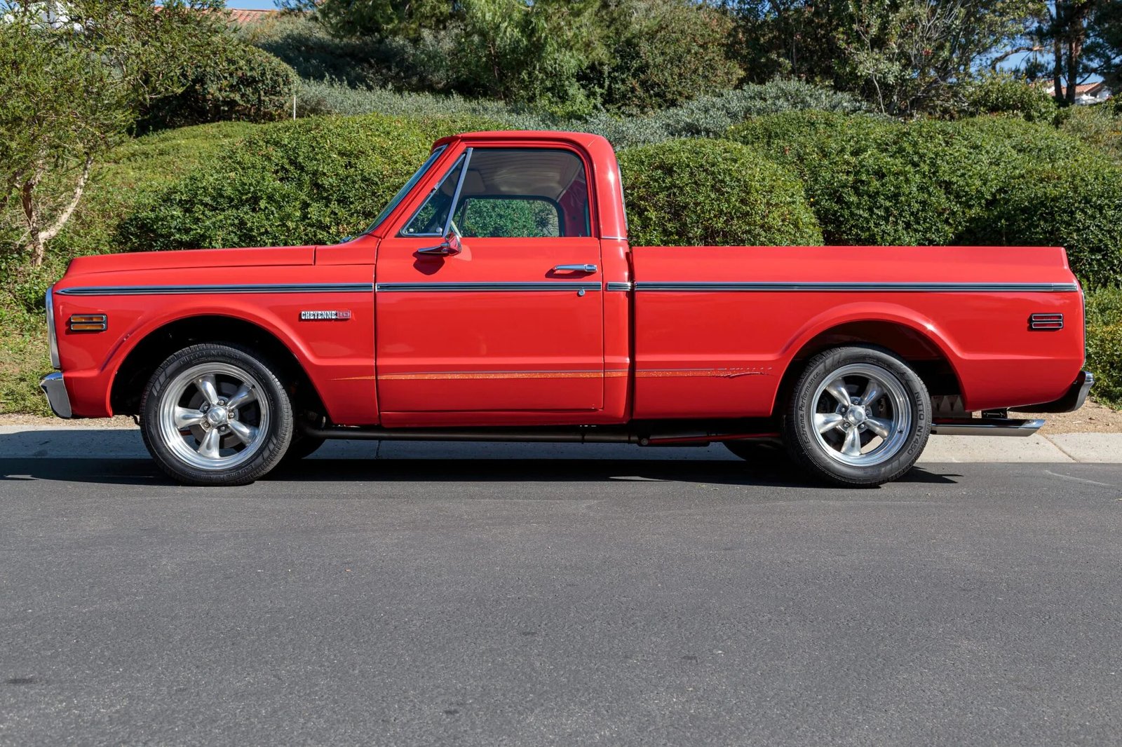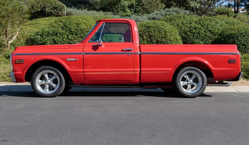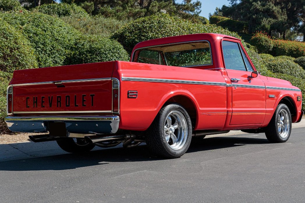 The truck was refinished in red during its late-1990s customization and features a modified front grille with a chrome surround, chrome bumpers, bodyside moldings, a painted lower-body stripe, dual side-view mirrors, black-painted Chevrolet lettering on the tailgate, and a dual-outlet exhaust.