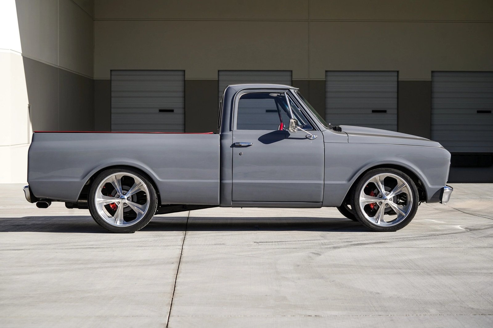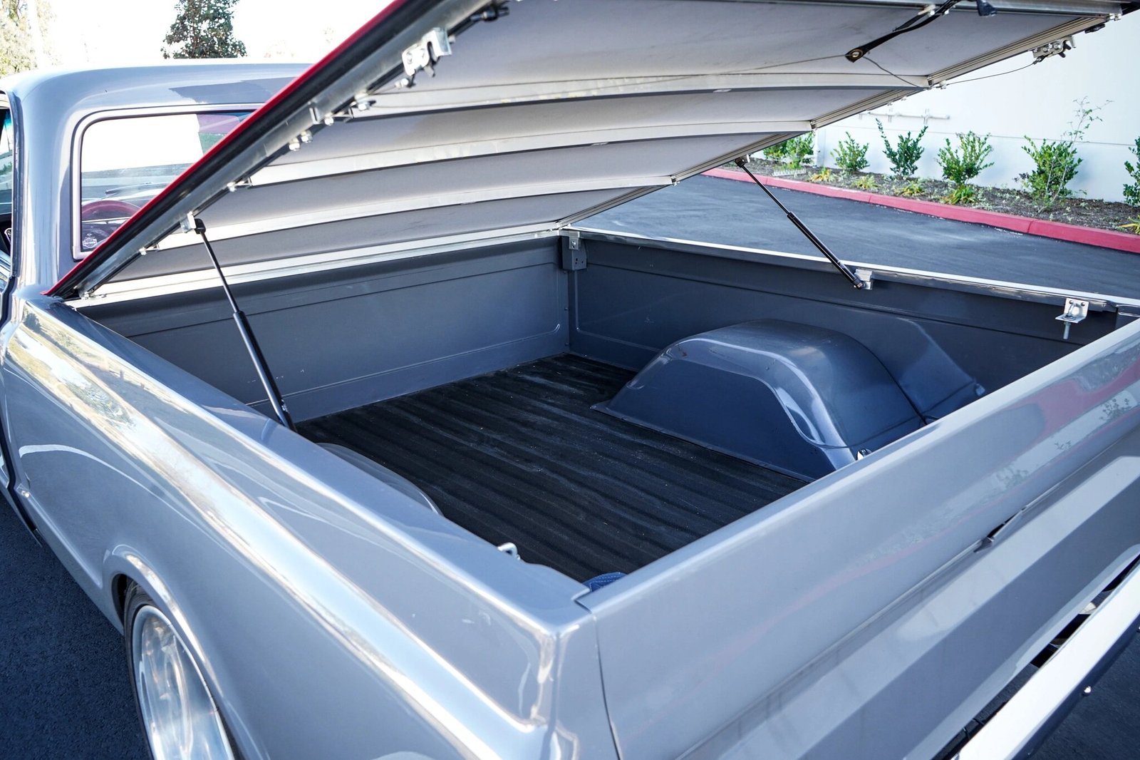 The truck has been repainted gray, and exterior features include an aftermarket cowled hood, chrome bumpers and side-view mirrors, LED lighting, a red hard tonneau bed cover, and a rubber bed liner.