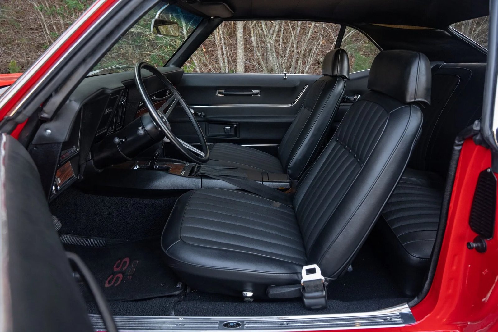 This 1969 Chevrolet Camaro coupe is powered by a replacement 355ci V8 mated to a Muncie four-speed manual transmission and is finished in Torch Red with black stripe decals over black vinyl upholstery. Equipment includes a cowl induction hood, front and rear spoilers, SS badging, power steering, power front disc brakes, staggered-diameter US Mags wheels, an Edelbrock intake manifold and carburetor, a Mallory distributor, an MSD ignition coil, Doug’s exhaust headers, a dual exhaust system with Flowmaster mufflers, and a Hurst shifter.