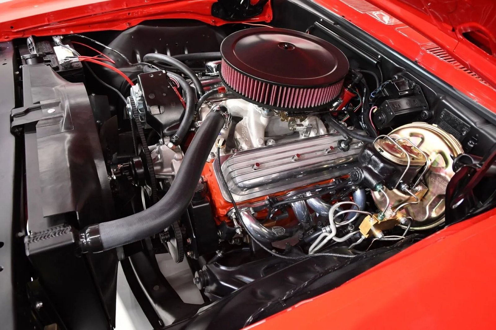 The 355ci V8 features an Edelbrock intake manifold and carburetor with an electric choke, along with a Mallory distributor, MSD ignition coil, Doug’s exhaust headers, a black-painted aluminum radiator, and finned valve covers.