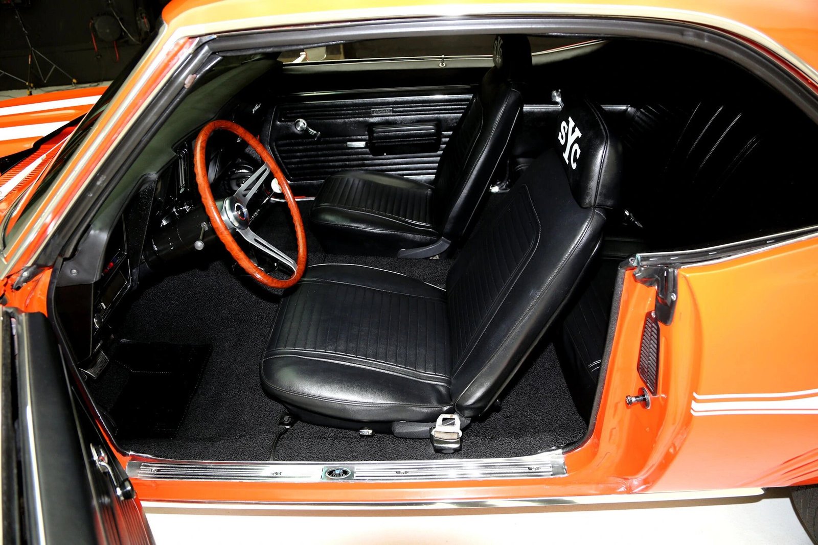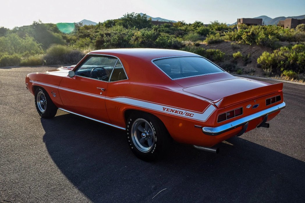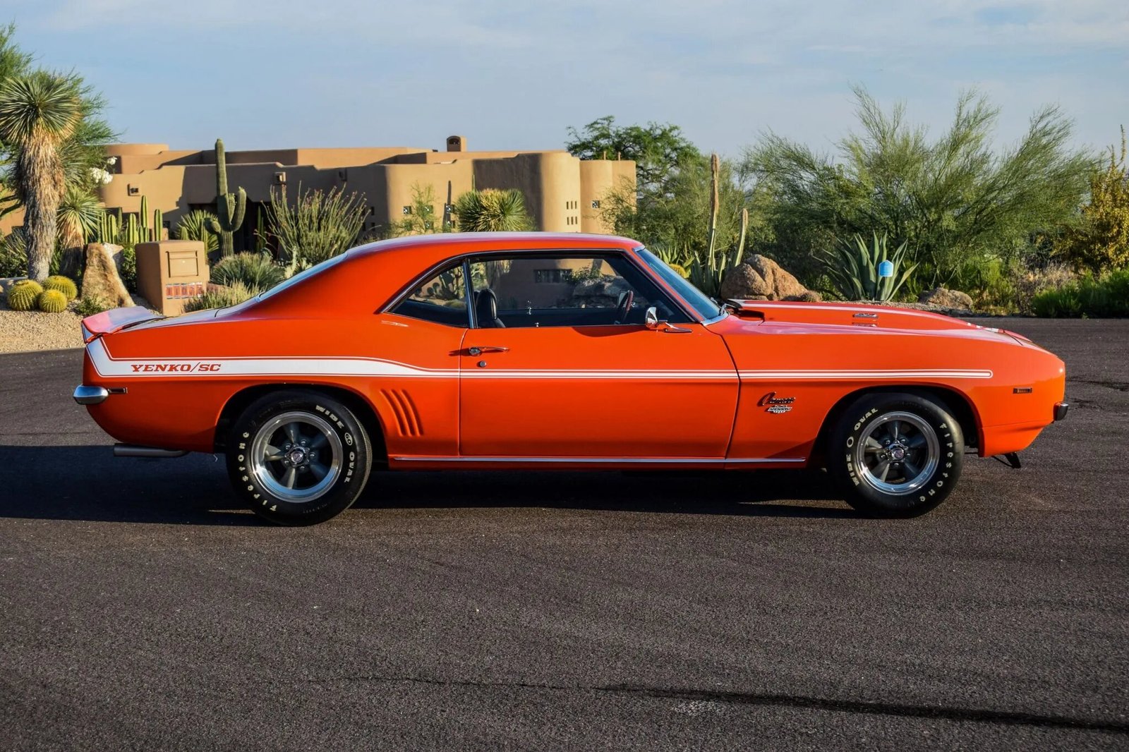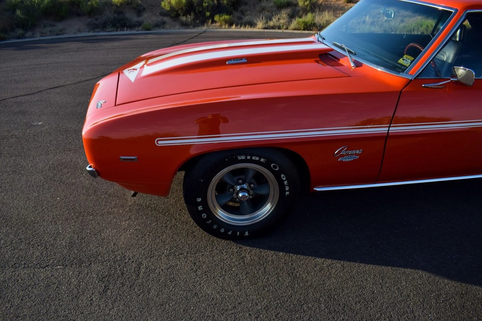 This 1969 Chevrolet Camaro coupe is finished in Hugger Orange with Yenko-style white stripes over a black interior and powered by a replacement 427ci V8 paired with a Muncie four-speed manual transmission and 12-bolt positraction 4.10:1 rear axle.