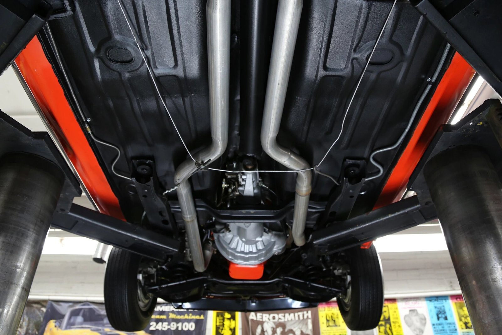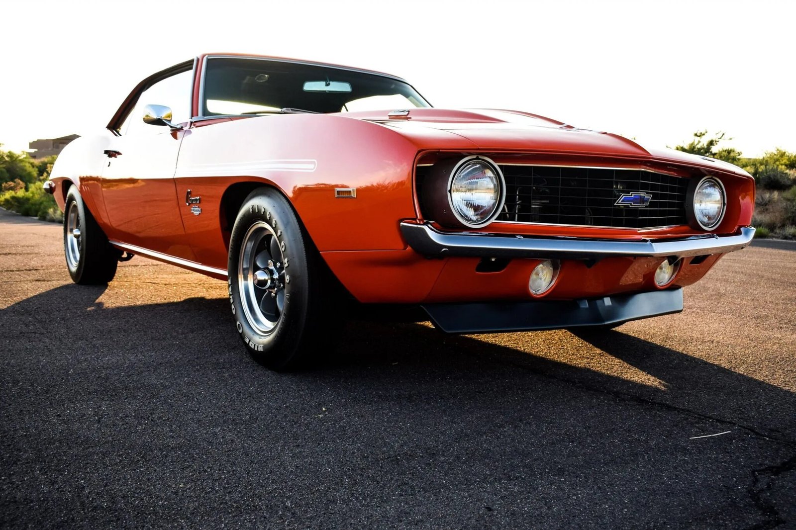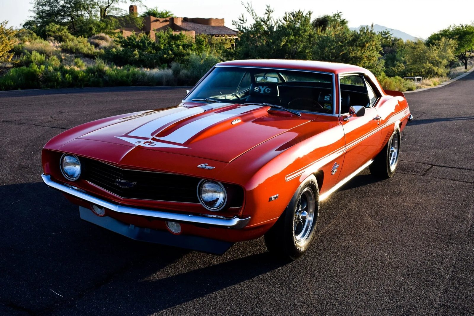 This 1969 Chevrolet Camaro coupe is finished in Hugger Orange with Yenko-style white stripes over a black interior and powered by a replacement 427ci V8 paired with a Muncie four-speed manual transmission and 12-bolt positraction 4.10:1 rear axle.