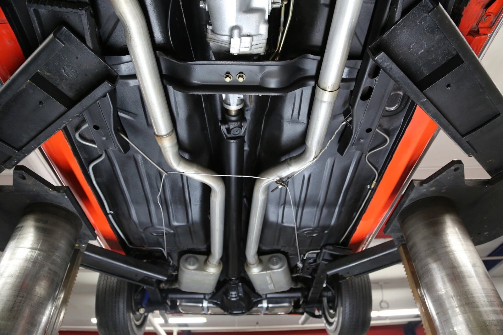 Features include a cowl-induction hood, front chin spoiler, rear decklid spoiler, chrome bumpers, drip rails, polished rocker panel trim, and a dual-outlet exhaust.
