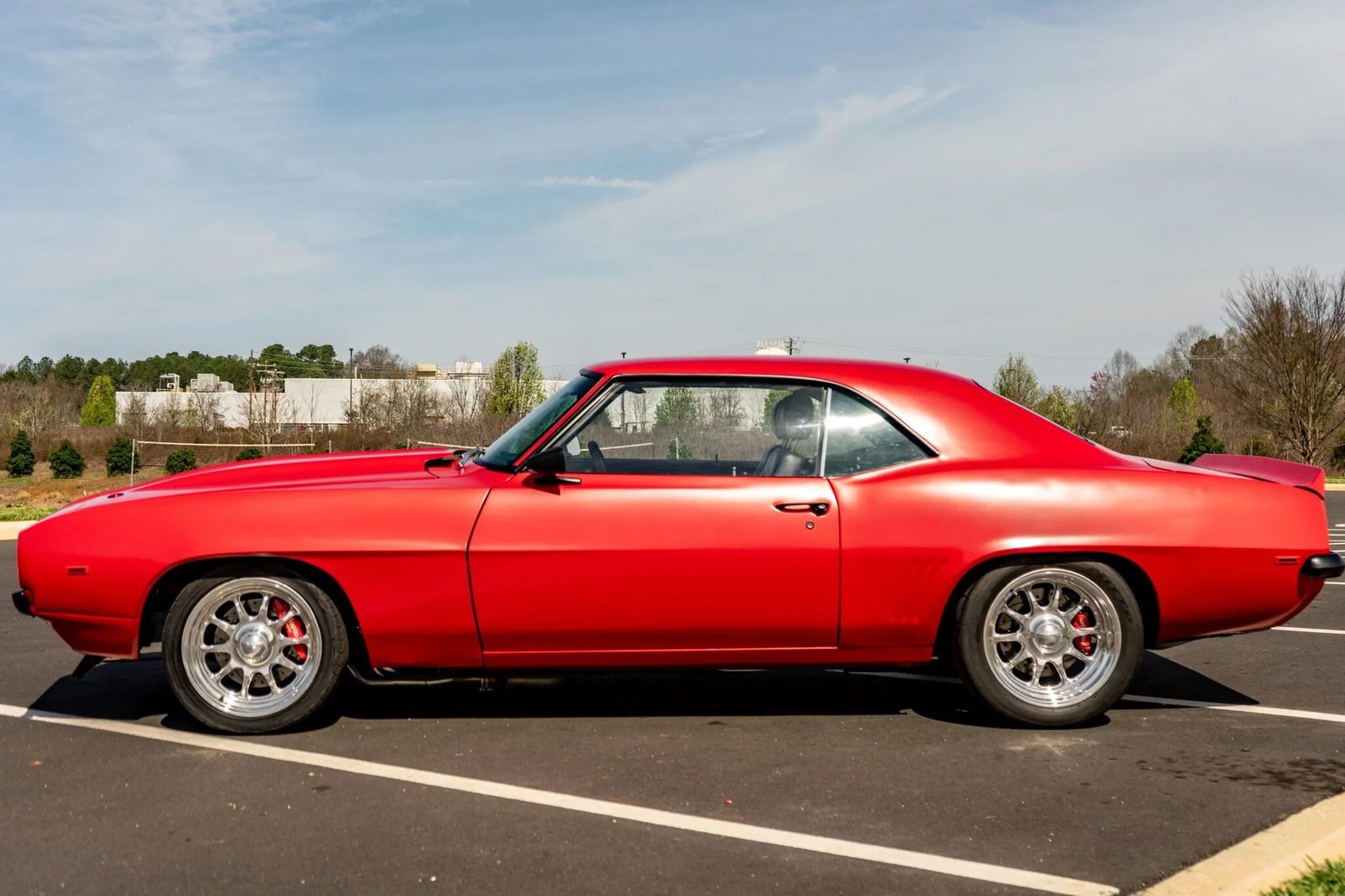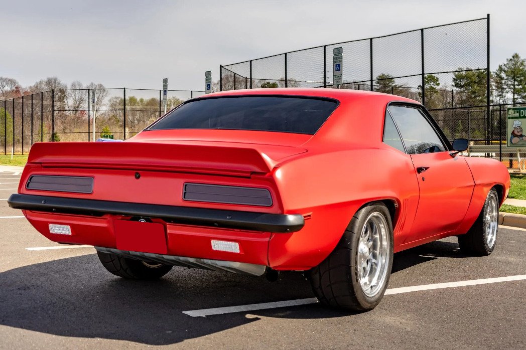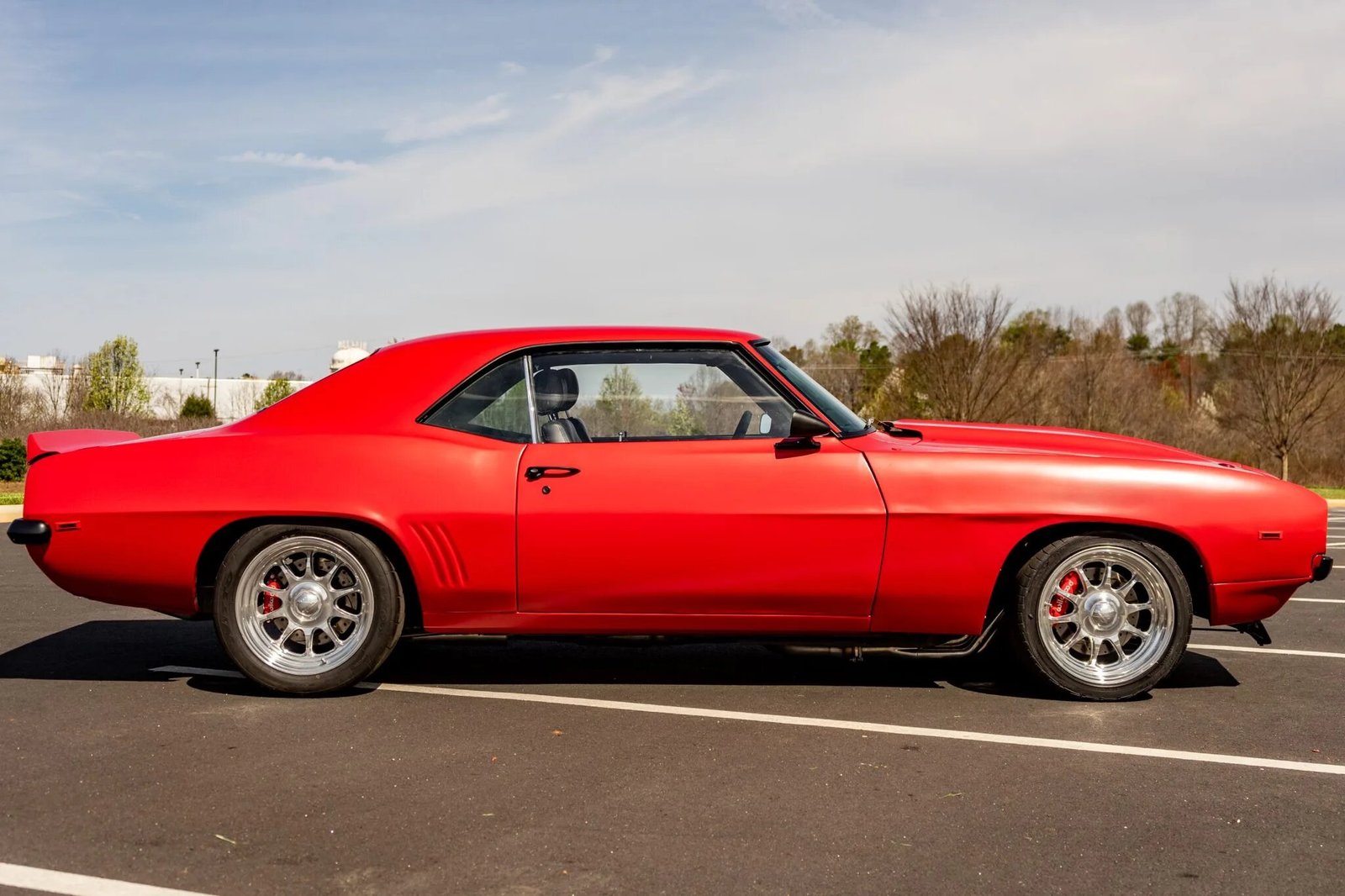 This 1969 Chevrolet Camaro is finished in a satin red vinyl wrap over black and powered by a 6.0-liter LQ9 V8 paired with a Tremec TKO600 five-speed manual transmission and a Detroit Speed nine-inch rear axle with 3.73:1 gears.