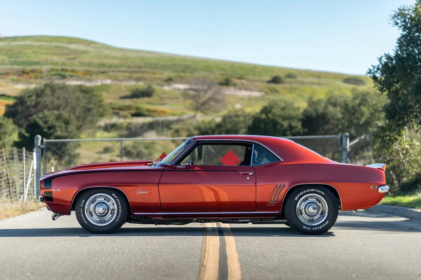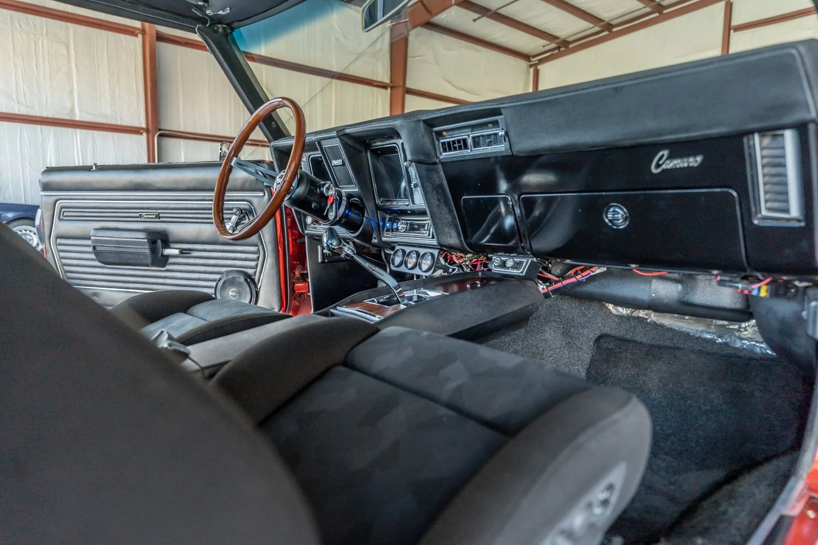 This 1969 Chevrolet Camaro coupe is finished in orange over black and powered by an LS3 V8 paired with a Tremec TKO600 five-speed manual transmission and a Moser 12-bolt rear axle with a 3.73:1 limited-slip differential.