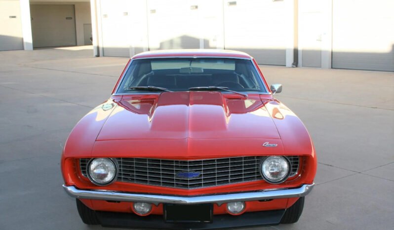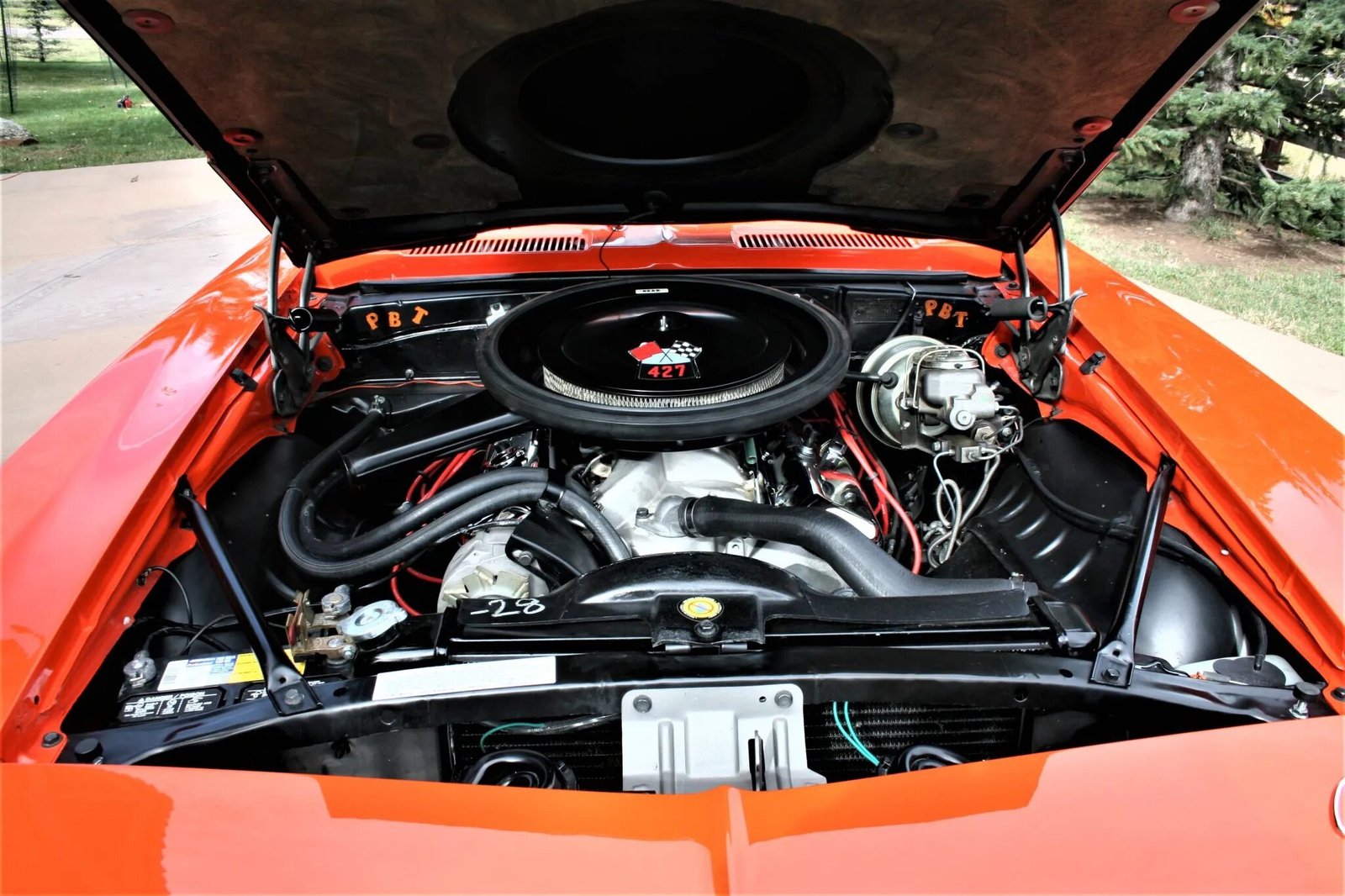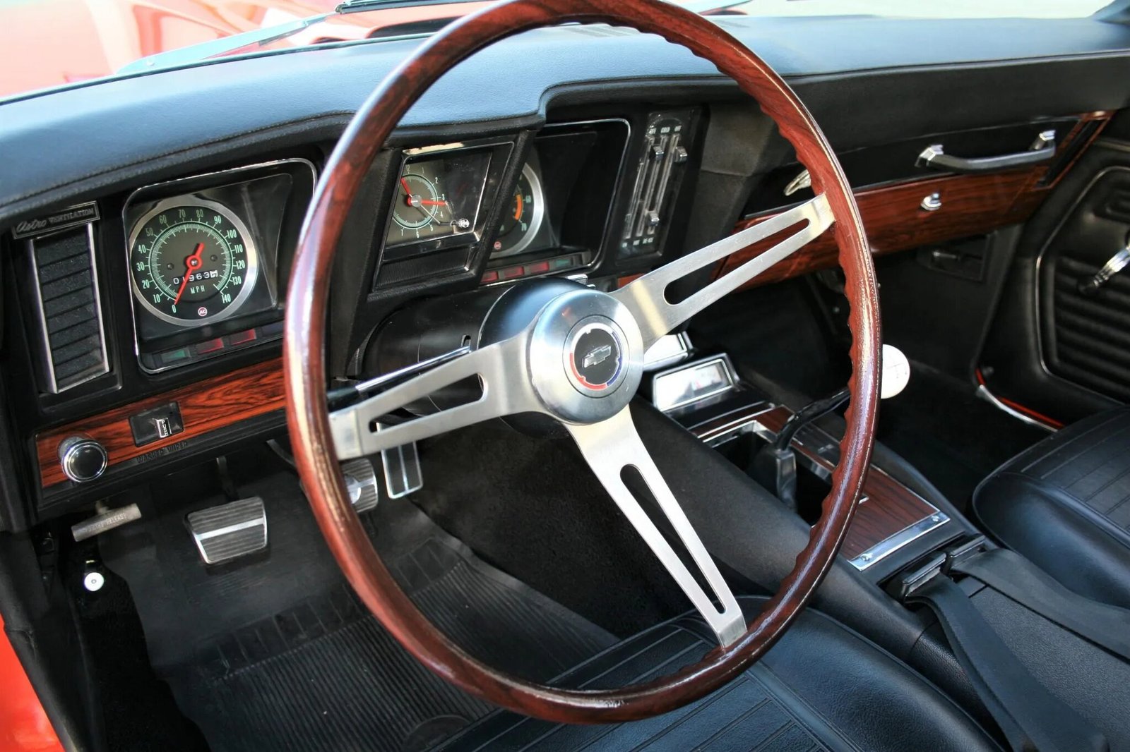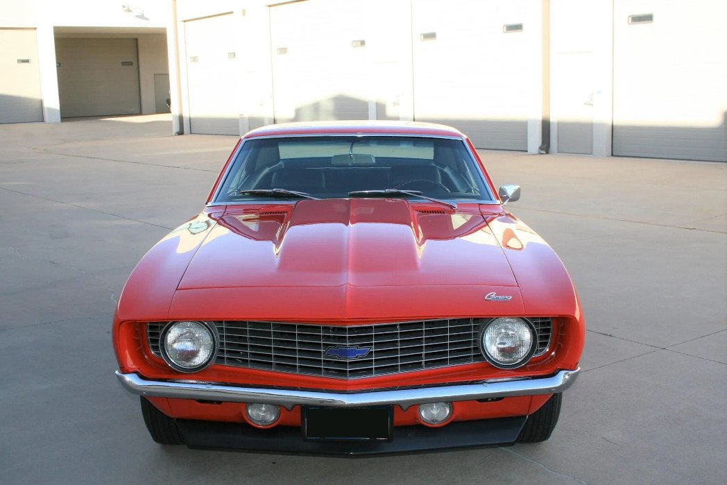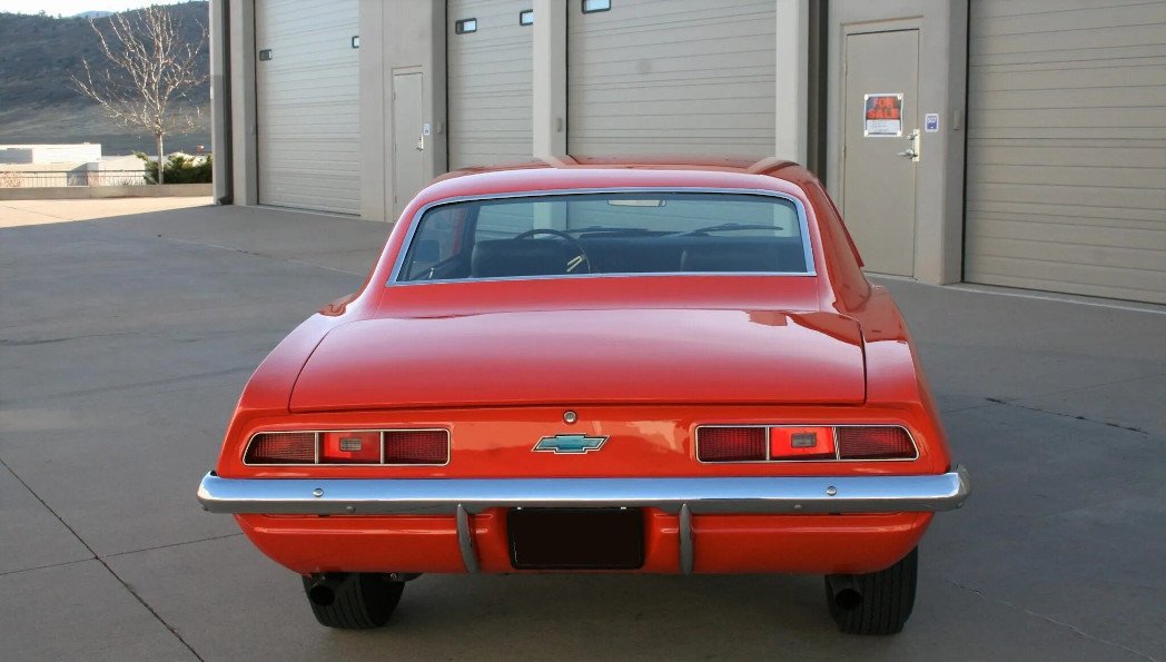 This 1969 Chevrolet Camaro coupe was subsequently fitted with a GM Performance 427ci V8, which is one of 427 examples produced to commemorate the RPO ZL1 engine that was available in 1969. The car was also refinished in orange and the black interior was refreshed. Shifting is through a four-speed manual transmission, and additional equipment includes a 3.73 Positraction rear end, body-color 14″ steel wheels, front disc brakes, power steering, chrome bumpers, a front spoiler, and an AM/FM radio.