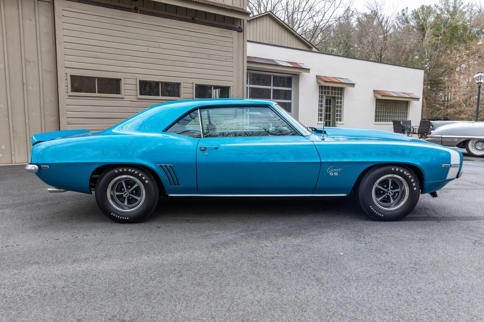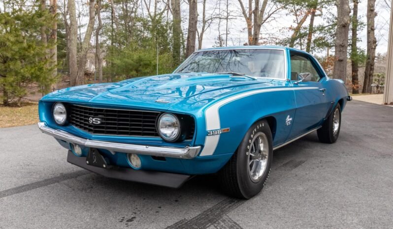 This 1969 Chevrolet Camaro coupe is powered by a 396ci V8 paired with a Muncie four-speed manual transmission and has been refinished in blue with white stripes over black vinyl upholstery. Equipment includes 14″ Super Sport wheels, power-assisted front disc brakes, a ducted hood, front and rear spoilers, a Hurst shifter, and an AM radio.