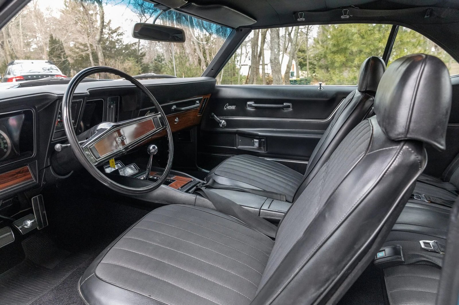 Additional equipment includes a Hurst shifter with a white knob as well as woodgrain trim, lap seatbelts, and an AM radio.