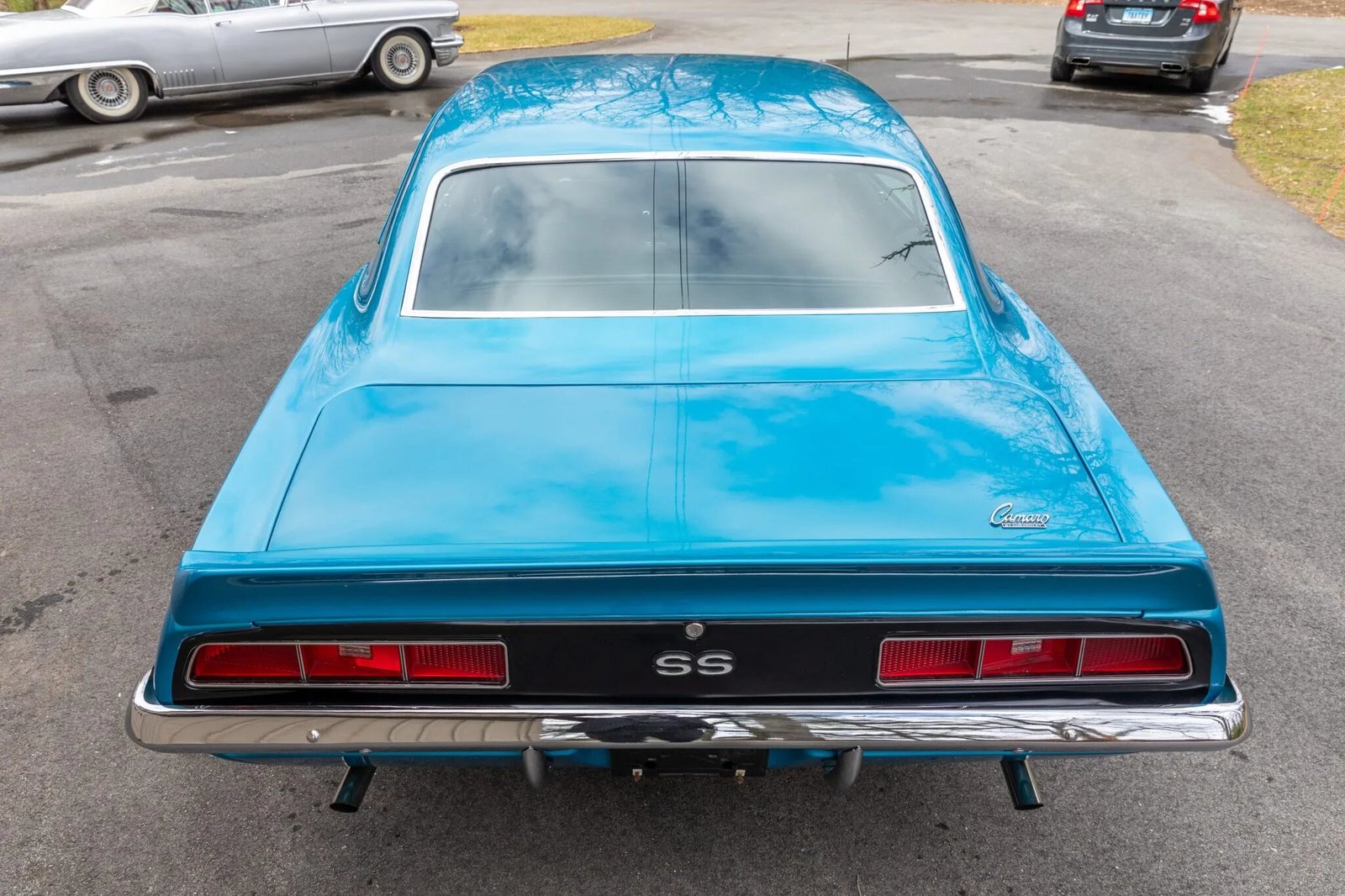 Polished 14″ Super Sport–style wheels wear Goodyear Polyglas white-letter tires.