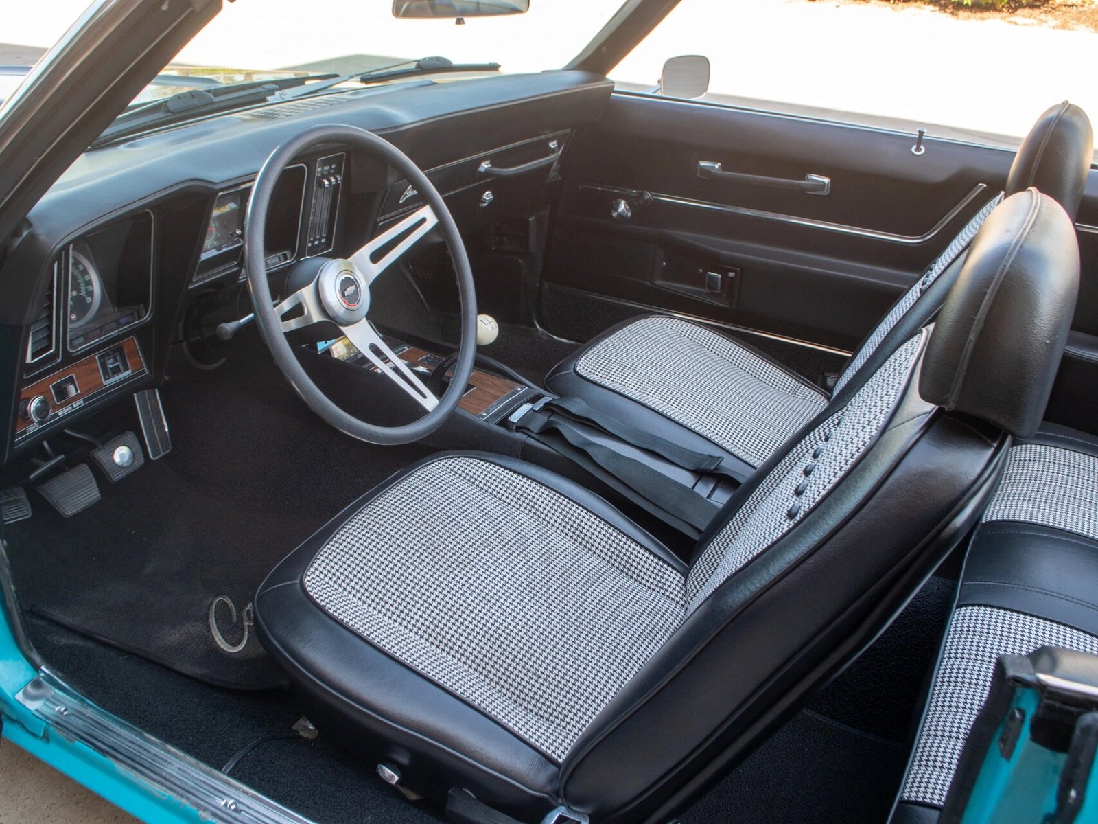 The front bucket seats are upholstered in black vinyl with houndstooth cloth inserts and are complemented by a black dashboard, door panels, and carpets.