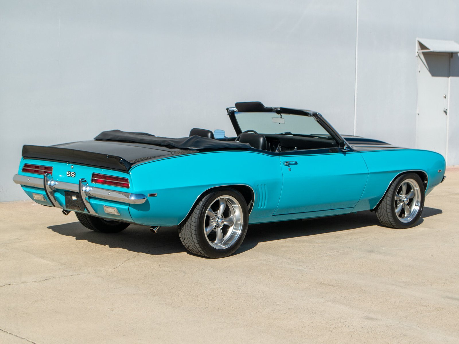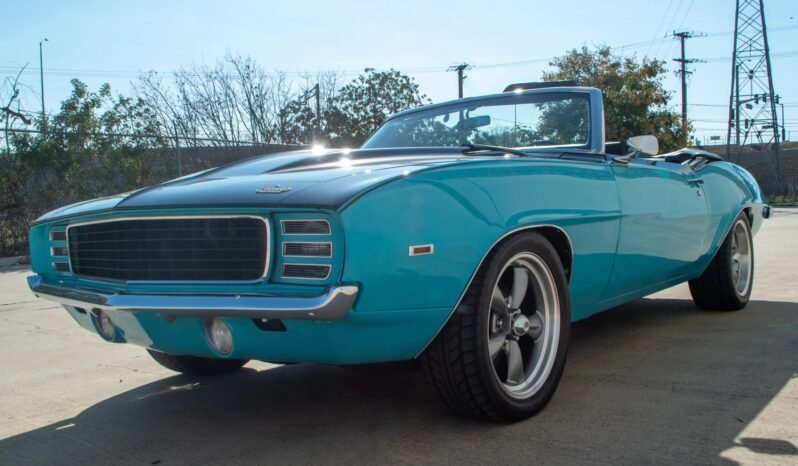 This 1969 Chevrolet Camaro convertible is finished in blue and black over black vinyl and houndstooth and is powered by a 406ci V8 paired with a four-speed manual transmission.