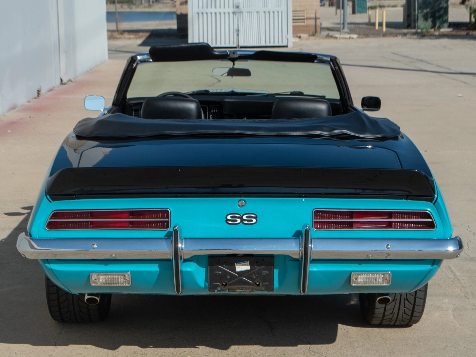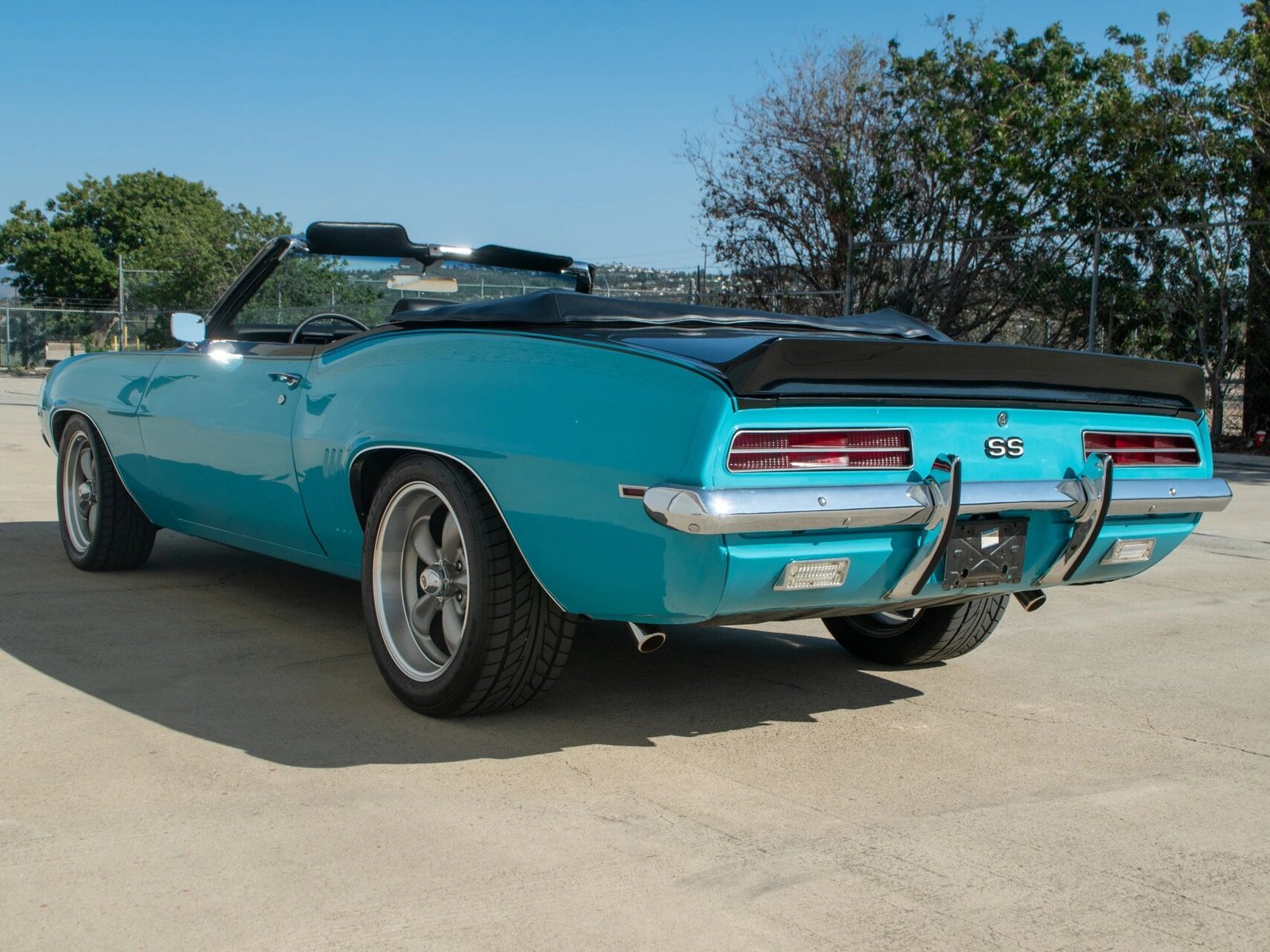 Features include a black power-operated soft top with a matching boot cover, a decklid spoiler, chrome-finished bumpers, fog lights, retractable headlight covers, a cowl induction hood, faux fender vents, and a dual-exit exhaust.