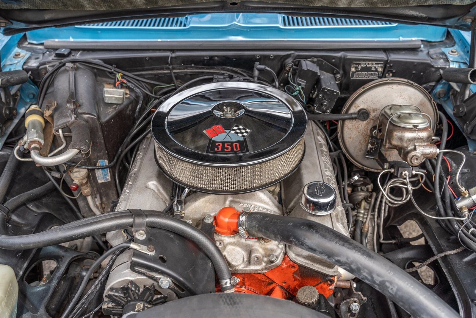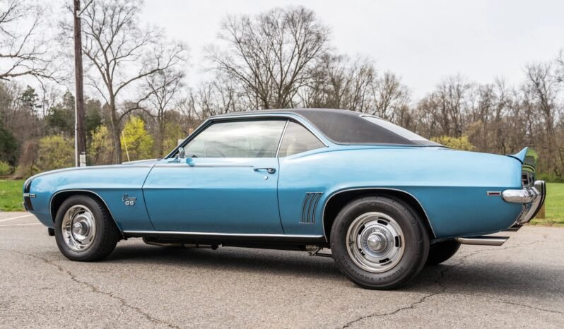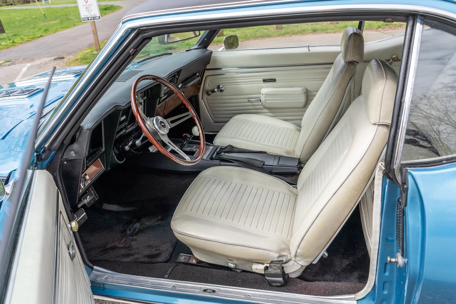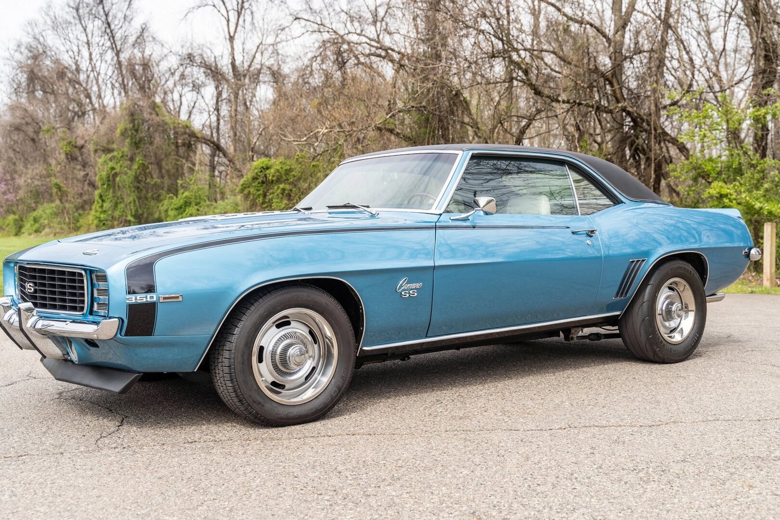 This 1969 Chevrolet Camaro is finished in blue over white and powered by a replacement 350ci V8 paired with a Tremec TKO 600 five-speed manual transmission and a 12-bolt Positraction rear axle with 4.11:1 gears.