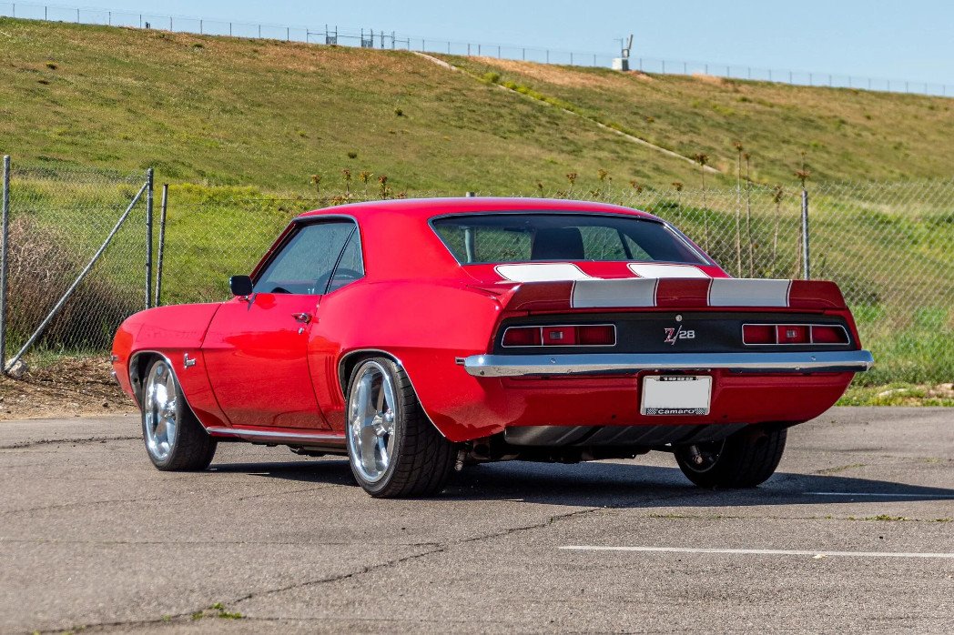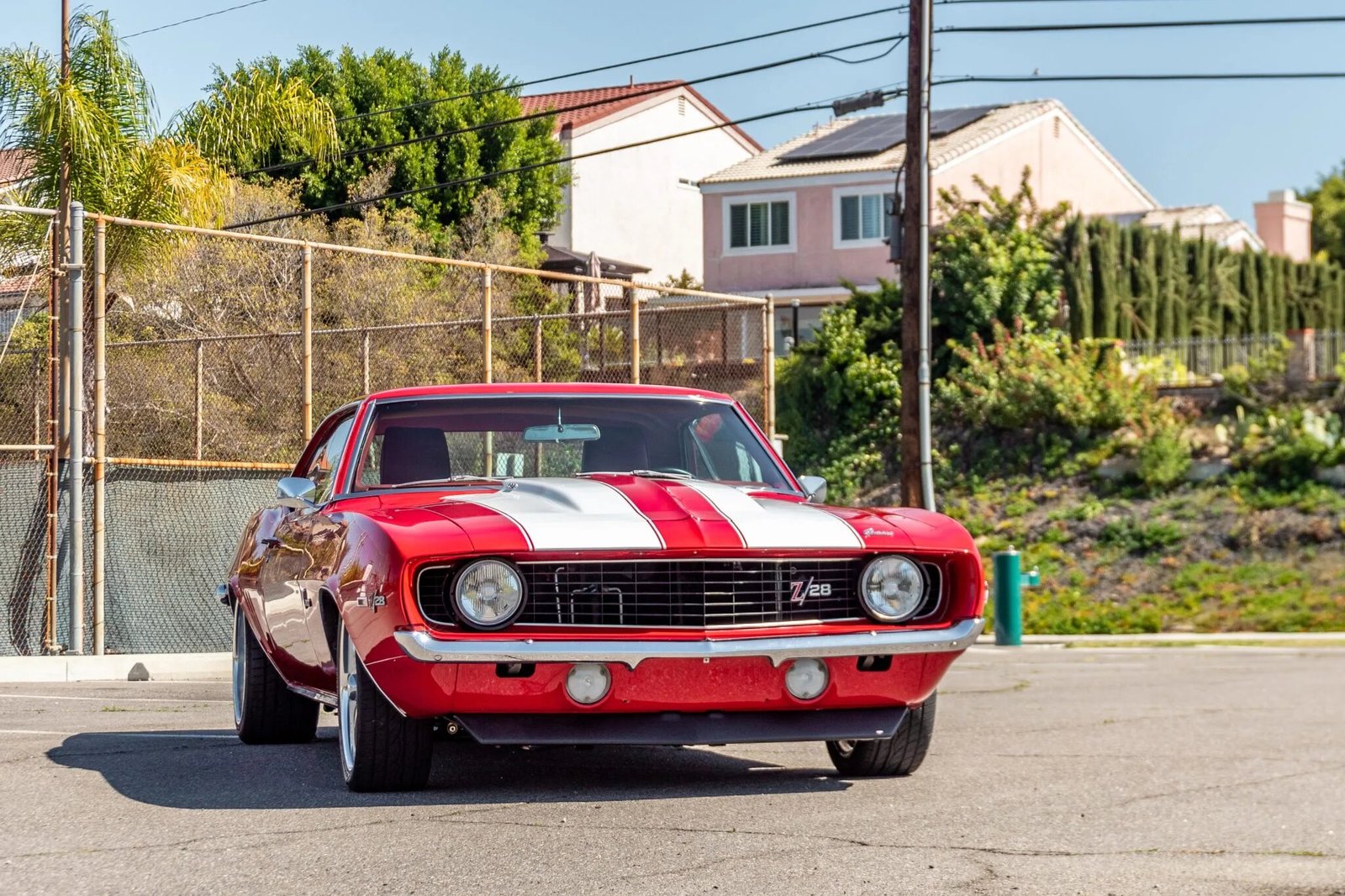 Exterior details include chrome-finished bumpers, a cowl induction hood with “302” badges, dual side mirrors, “Z/28” badging, and dual exhaust outlets.