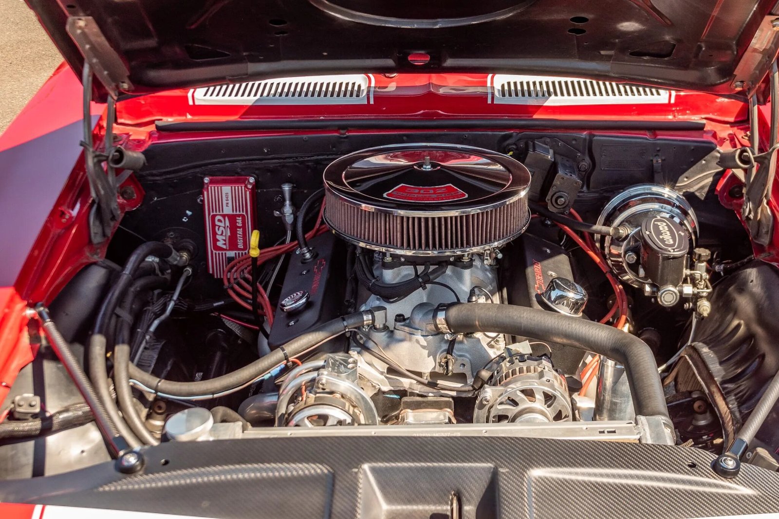 The 383ci stroker V8 features FiTech fuel injection, MSD electronic ignition, tubular headers, a dual exhaust system, an aluminum radiator, an American Autowire wiring harness, and Chevrolet-branded valve covers.