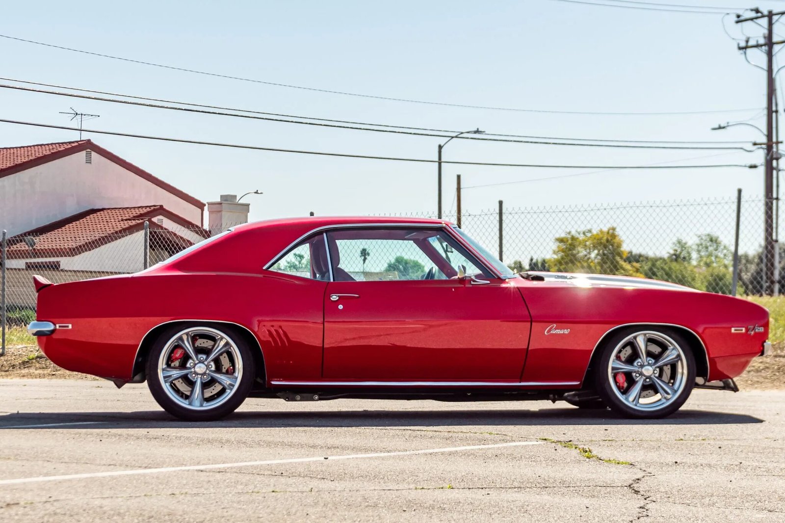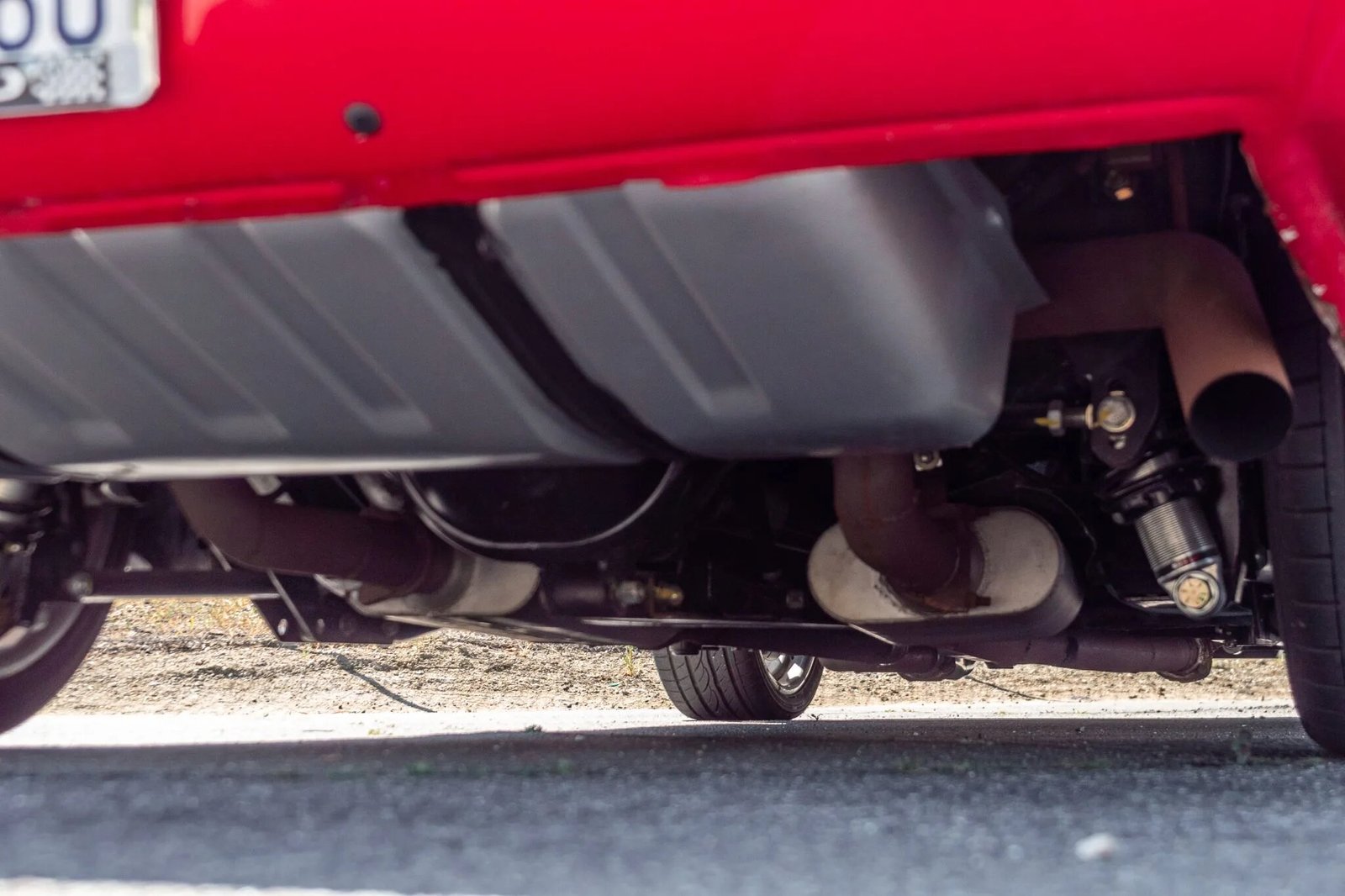 The brakes and suspension have been modified with the following components: Wilwood six-piston front- and four-piston rear calipers, Two-piece slotted and cross-drilled rotors, TCI Pro Touring front suspension system, TCI Torque Arm rear suspension, Fox adjustable coilovers.