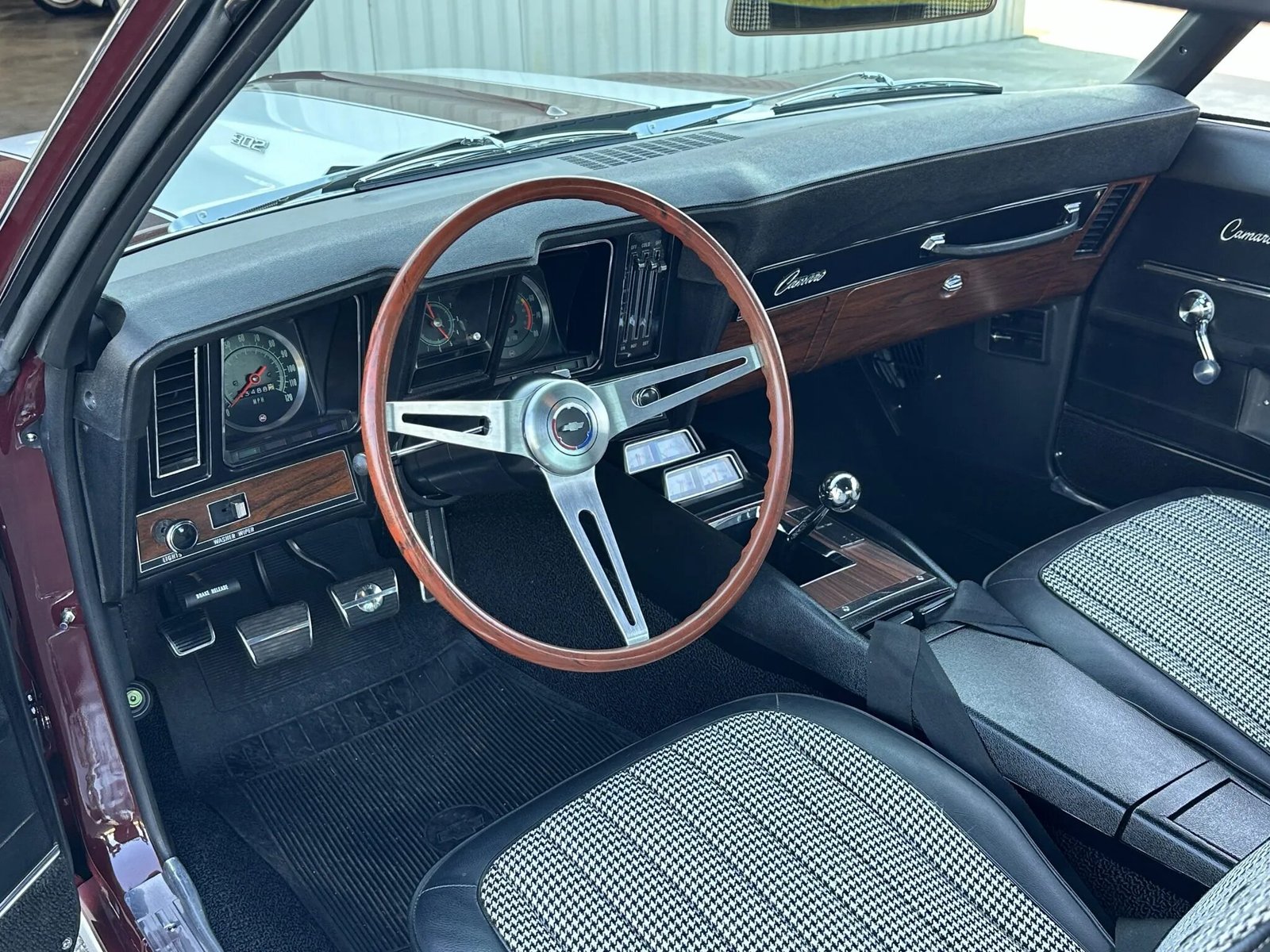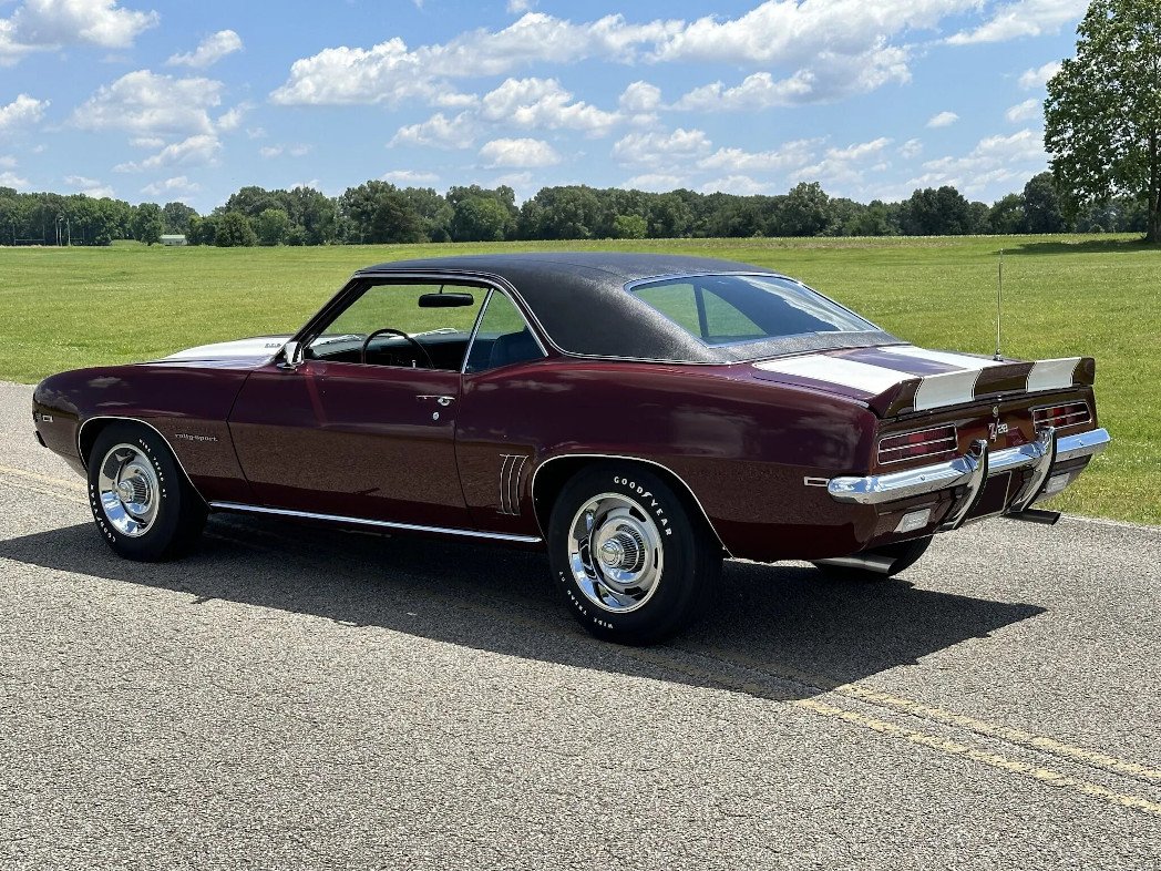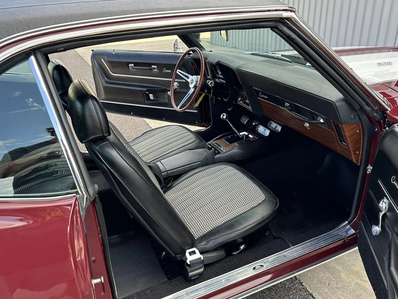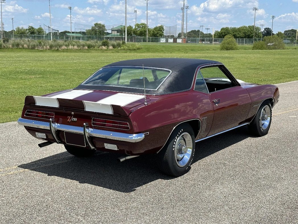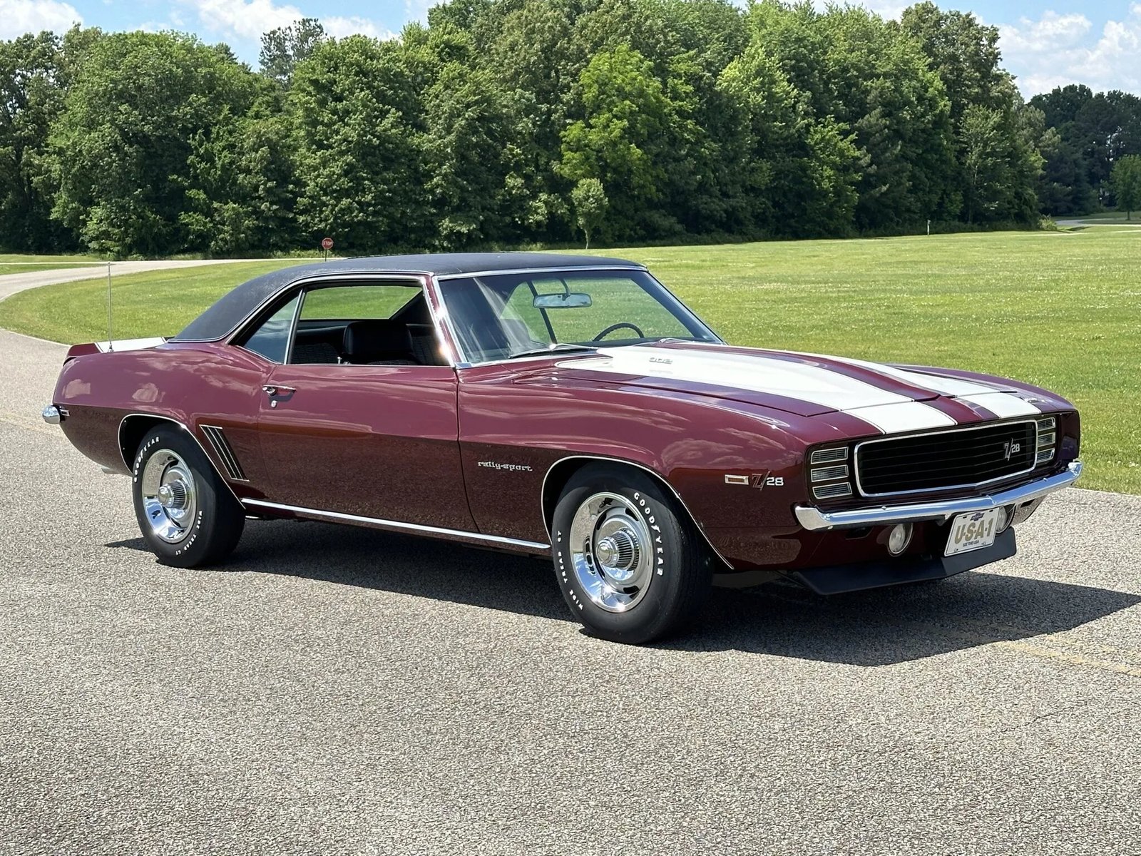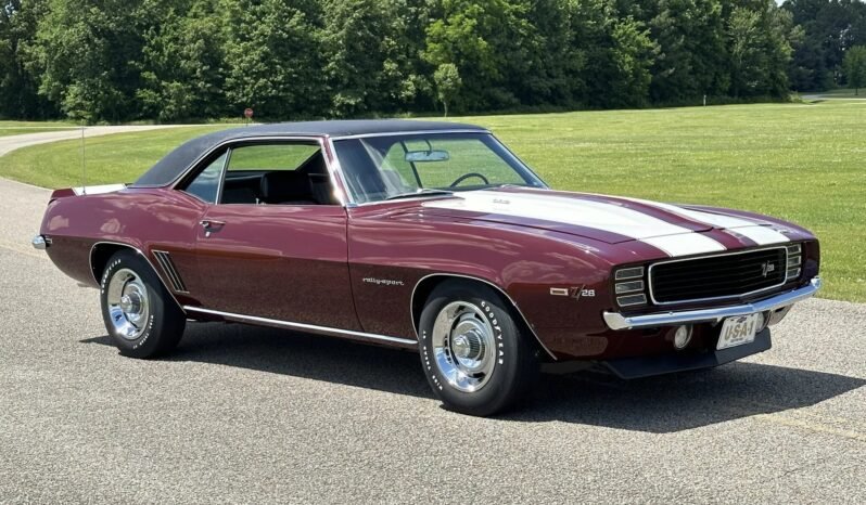 This 1969 Chevrolet Camaro Z/28 coupe have been the subject of a multi-year refurbishment that concluded in 2019. The car is powered by a 302ci Z28 V8 paired with a four-speed manual transmission and is refinished in burgundy over two-tone upholstery. Equipment includes a Positraction differential, 15″ Rally wheels, front disc brakes, power-assisted steering, a black vinyl roof, white stripes, concealed headlights, chrome bumpers, front and rear spoilers, an AM radio, and a cabin heater.