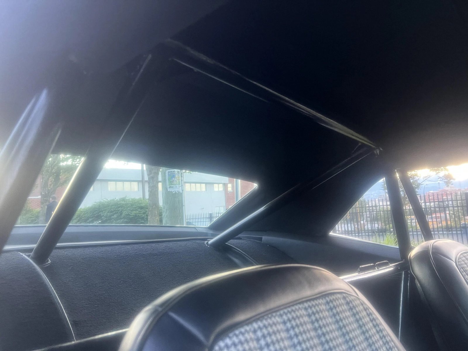 The interior features a roll cage and bucket seats that have been retrimmed with black upholstery and houndstooth inserts.