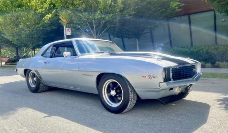 This 1969 Chevrolet Camaro Z/28 coupe has been refurbished and modified, which included repainting the exterior in silver with black stripes, recovering the seats with black upholstery and houndstooth inserts, and installing an LS3 6.2-liter V8, a five-speed manual transmission, and a 9″ rear axle mounted on a four-link suspension.