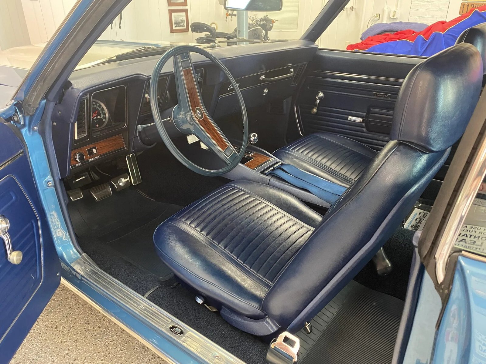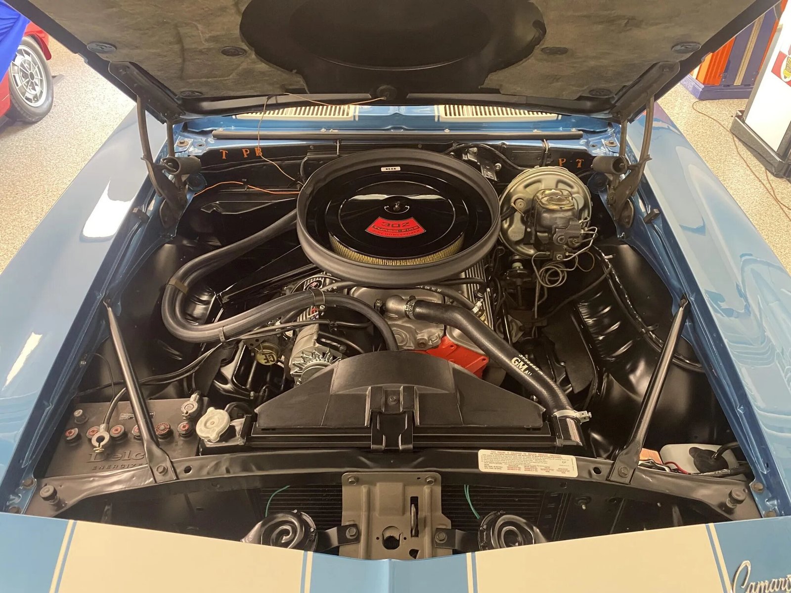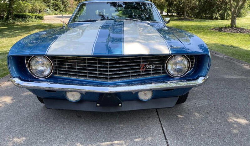 This 1969 Chevrolet Camaro Z/28 was refurbished in 2008. The car is powered by a 302ci V8 paired with a four-speed manual transmission and is finished in LeMans Blue with white stripes over blue vinyl upholstery. Equipment includes a Positraction differential, 15″ Rally wheels, power-assisted front disc brakes, chrome bumpers, front and rear spoilers, an AM radio, and a cabin heater.