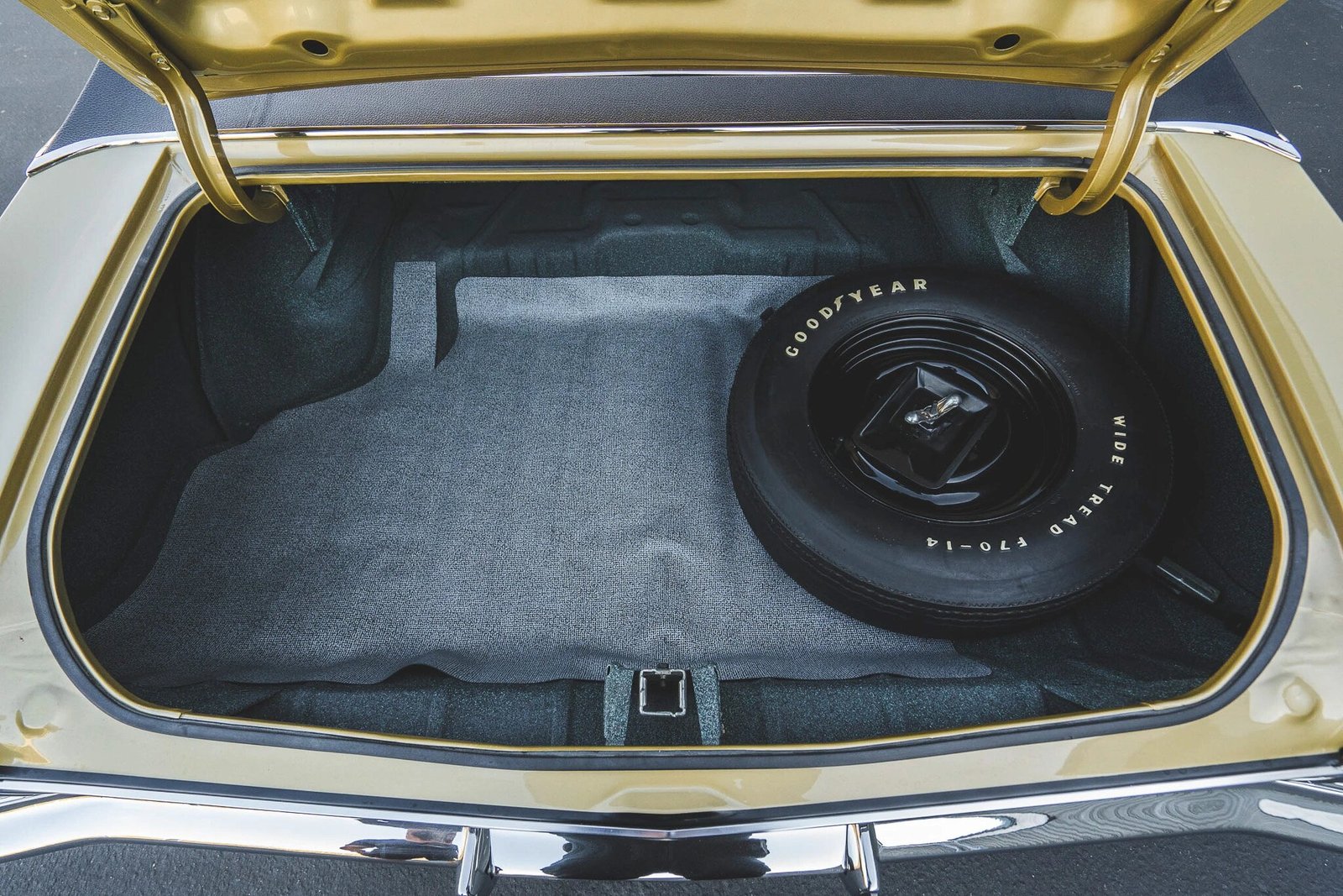 The car was delivered new in Olympic Gold (65) and has been refinished, featuring a black vinyl top, a driver-side mirror, SS badging, chrome bumpers, and dual exhaust outlets.