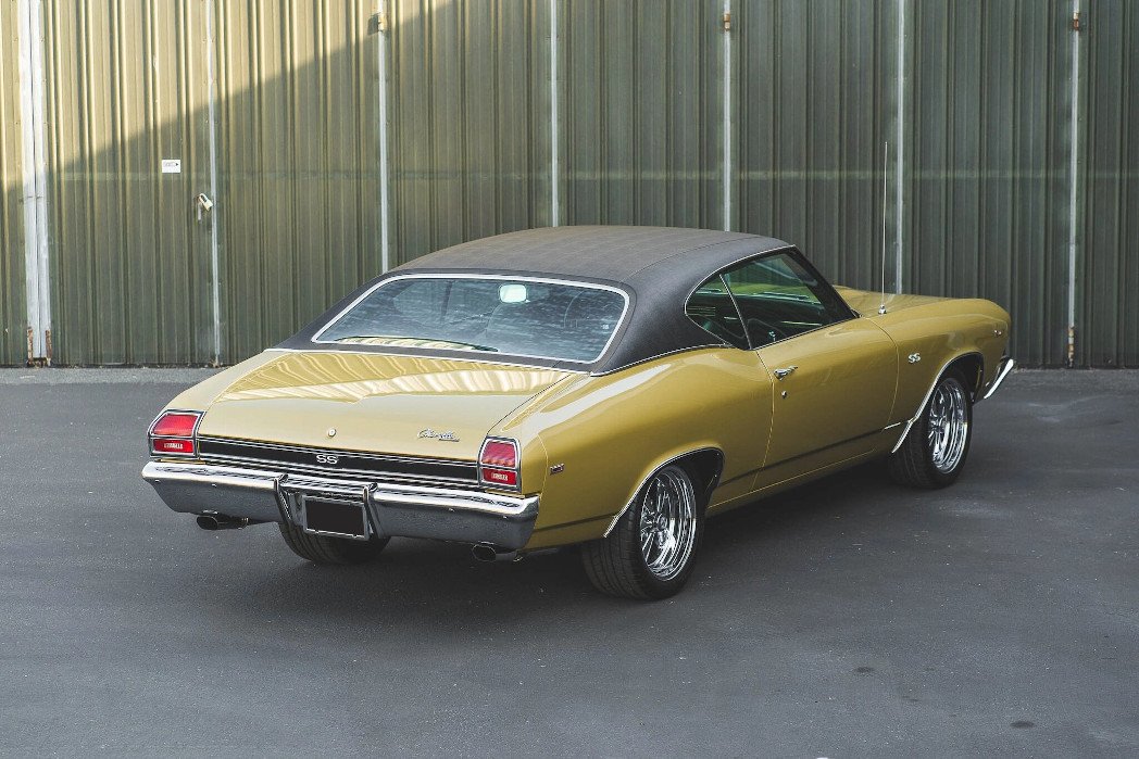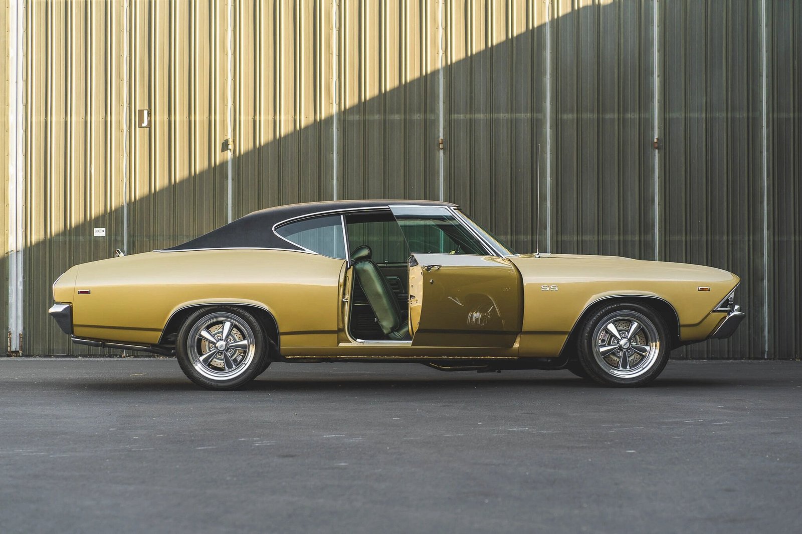 This 1969 Chevrolet Chevelle SS hardtop coupe has been refinished in gold over green with a black vinyl roof, and a GM ZZ430 350ci V8 crate engine has been installed along with a Richmond six-speed manual transmission.
