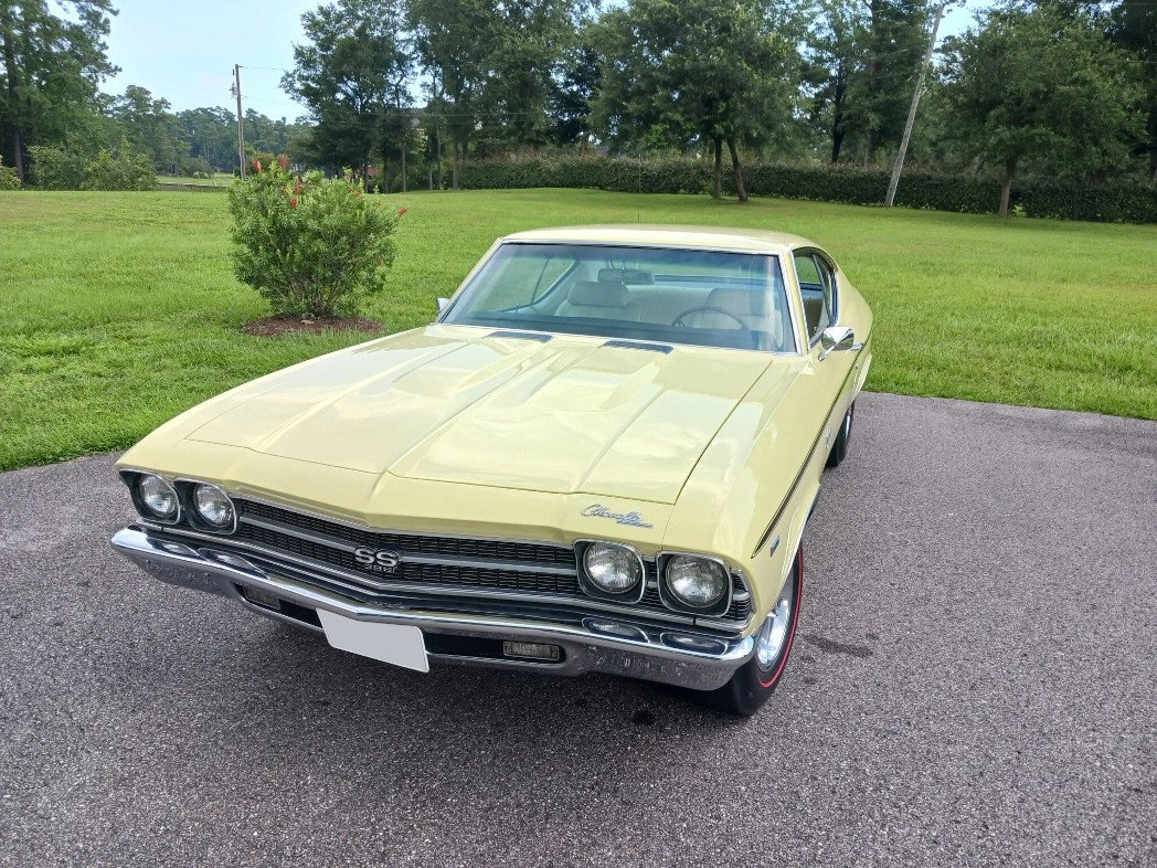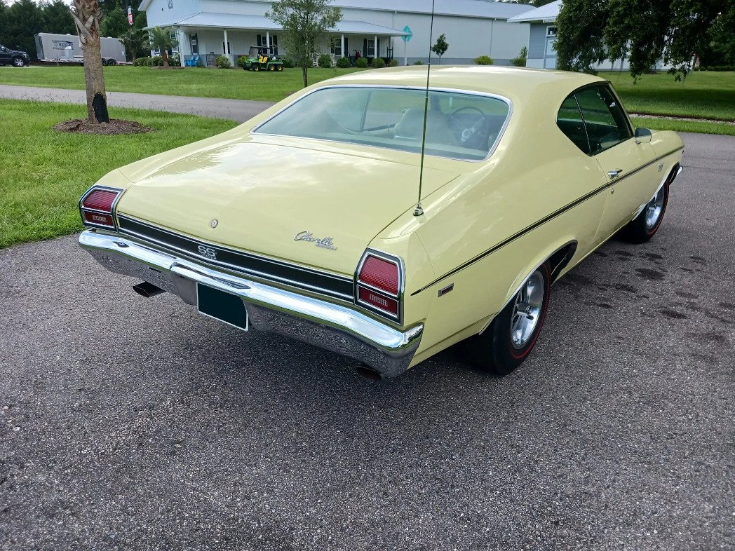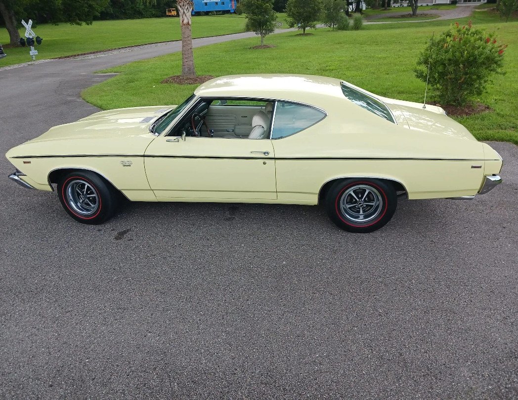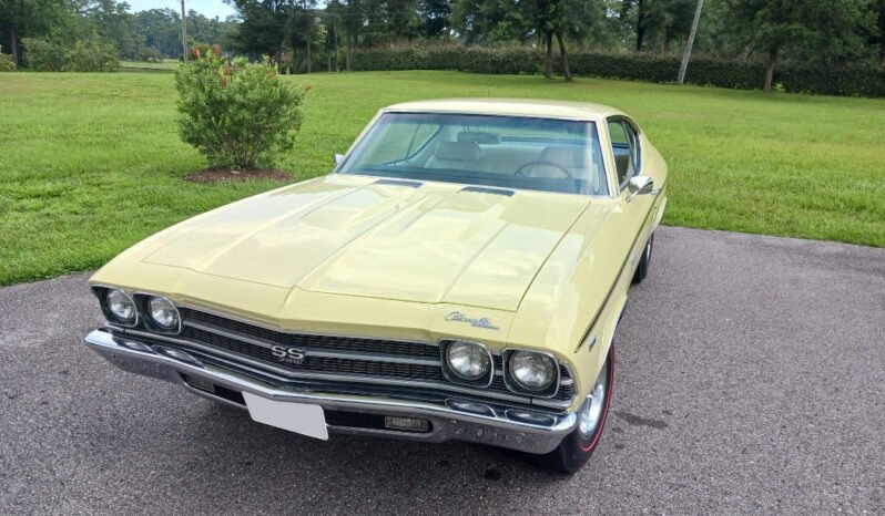 This 1969 Chevrolet Chevelle SS sport coupe was sold new by John Lamb Chevrolet of Winter Garden, Florida, and it underwent a refurbishment completed in 2009. The car was refinished in Butternut Yellow over Parchment upholstery and is powered by a 396ci V8 mated to a four-speed manual transmission and a 3.55:1 differential. Additional equipment includes a Quadrajet four-barrel carburetor, 14″ Super Sport-style wheels, power-assisted front disc brakes, power steering, chrome trim, quad headlights, black side stripes, a Hurst shifter, and a Delco AM radio. Work in preparation for sale included replacing the starter, distributor cap and rotor, spark plugs, and ignition wires along with changing the oil.