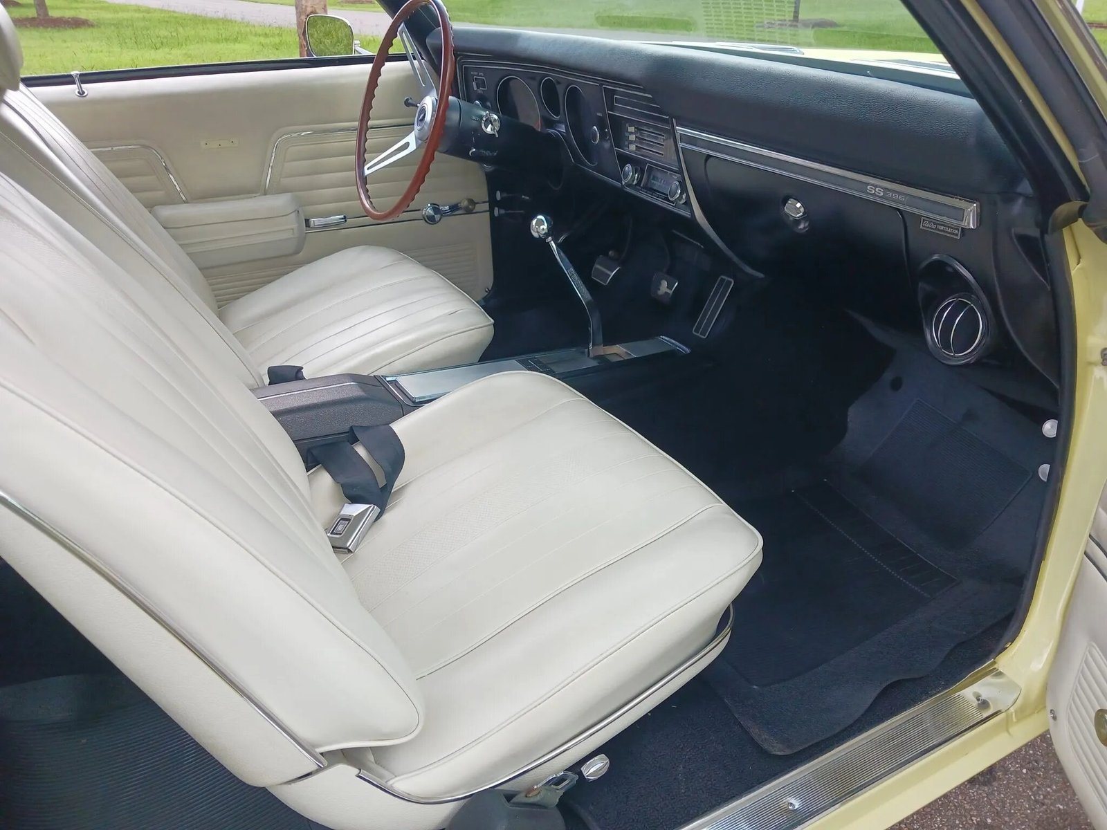 The body left the factory in Butternut Yellow (40) and was refinished with black side stripes as part of the 2009 refurbishment. Exterior features include side mirrors, quad headlights, SS396 badging, a dual exhaust system with oblong outlets, and chrome trim on the bumpers, grille, wheel arches, and window surrounds.