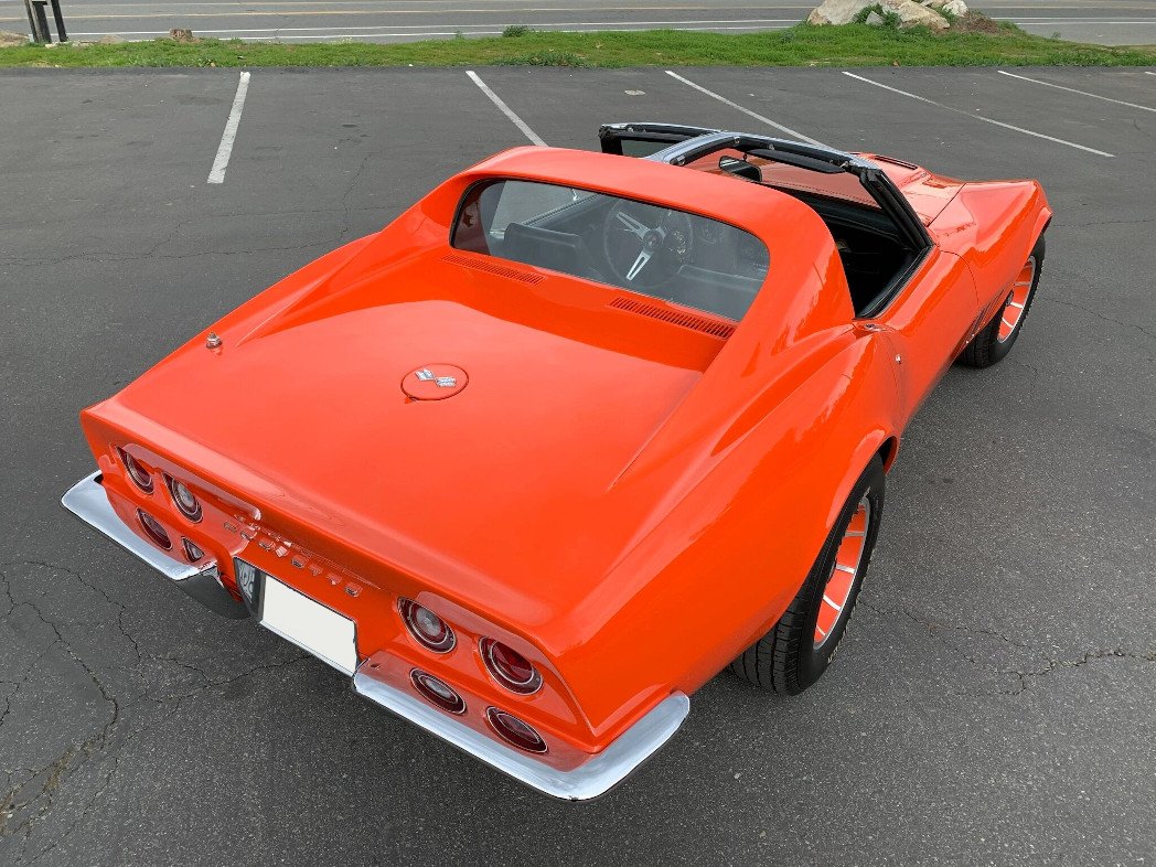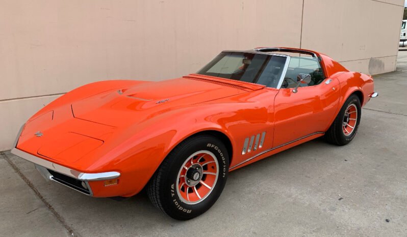 This 1969 Chevrolet Corvette coupe is finished in orange over black and powered by a replacement 454ci V8 paired with a Muncie four-speed manual transmission.