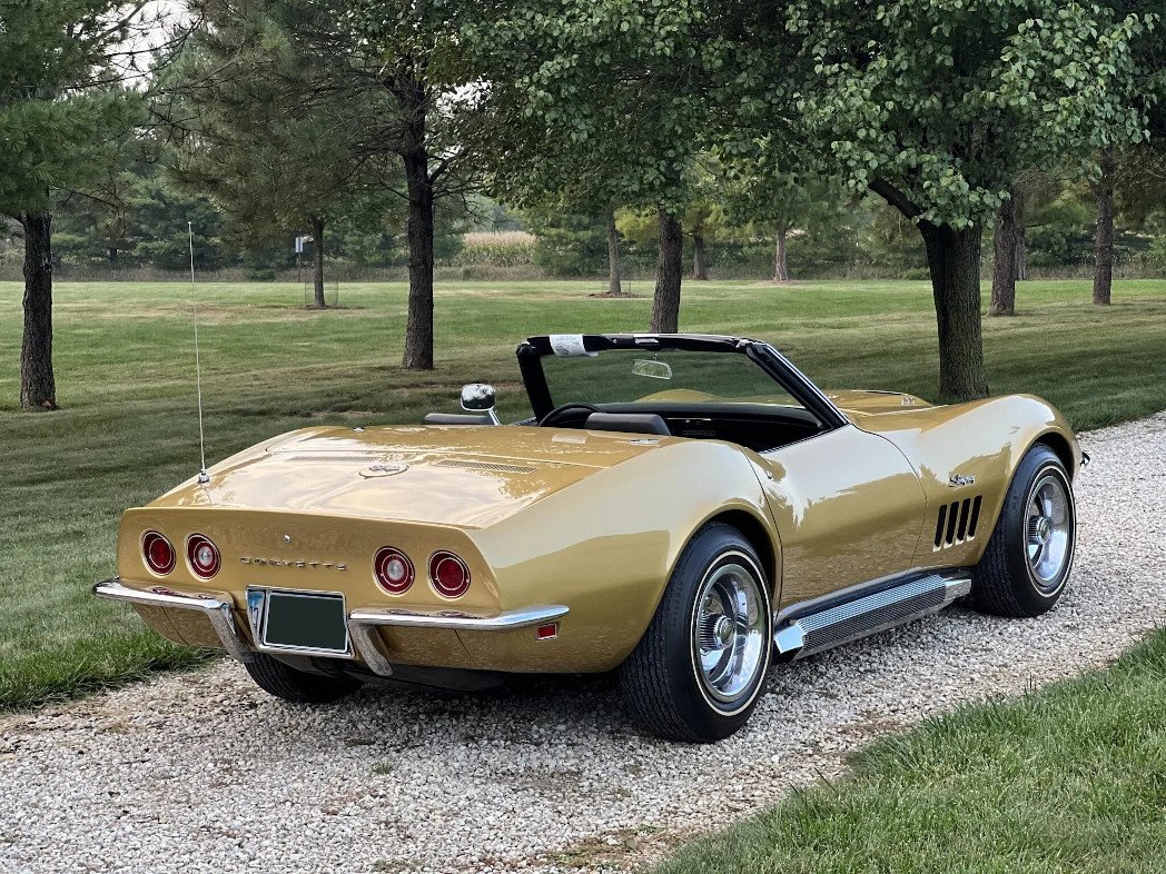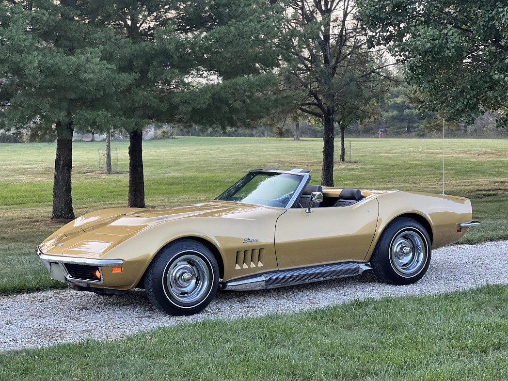 This 1969 Chevrolet Corvette convertible was one of a reported 390 to be optioned with the L89 aluminum cylinder heads. Refurbishment work in the early 2000s included the installation of a replacement 427ci V8, rebuilds of the four-speed manual transmission and Positraction limited-slip differential, and overhauls of the suspension and brake systems as well as a repaint in gold and the reupholstering of the interior in black. Equipment includes a black convertible soft top, a removable hardtop, 15″ Rally wheels, four-wheel disc brakes, side-exit exhaust pipes, a heater, an AM/FM radio, chrome bumpers, and retractable headlights. The rocker arms, push rods, distributor rotor, spark plugs, and air pump were replaced in 2017.