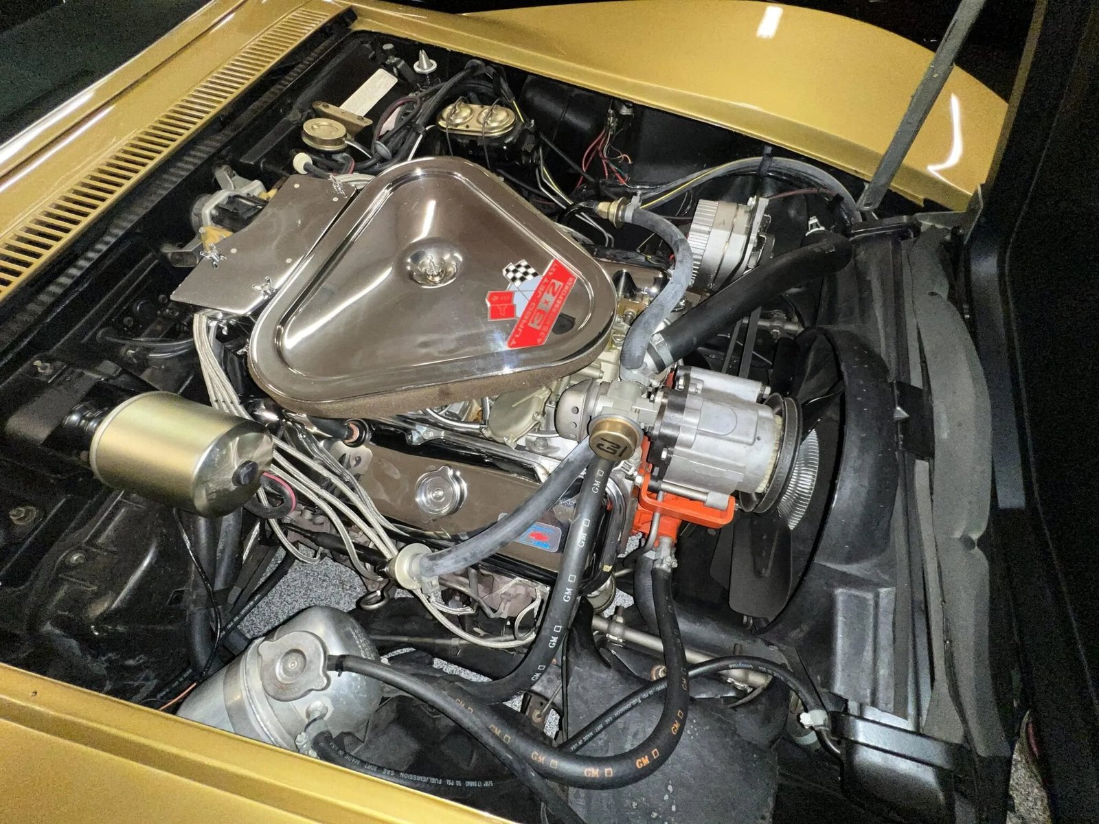 The replacement 427ci V8 was rebuilt and installed in 2000 and features three Holley double-barrel carburetors. Work in 2017 and 2018 included replacing the rocker arms, push rods, distributor rotor, spark plugs, and air pump as well as carburetor and valve adjustments. The oil was changed in preparation for sale.
