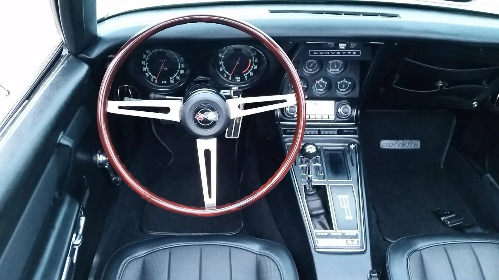 The cabin features bucket seats upholstered in black vinyl along with a matching dashboard, door panels, replacement carpets, and Corvette-branded floor mats.
