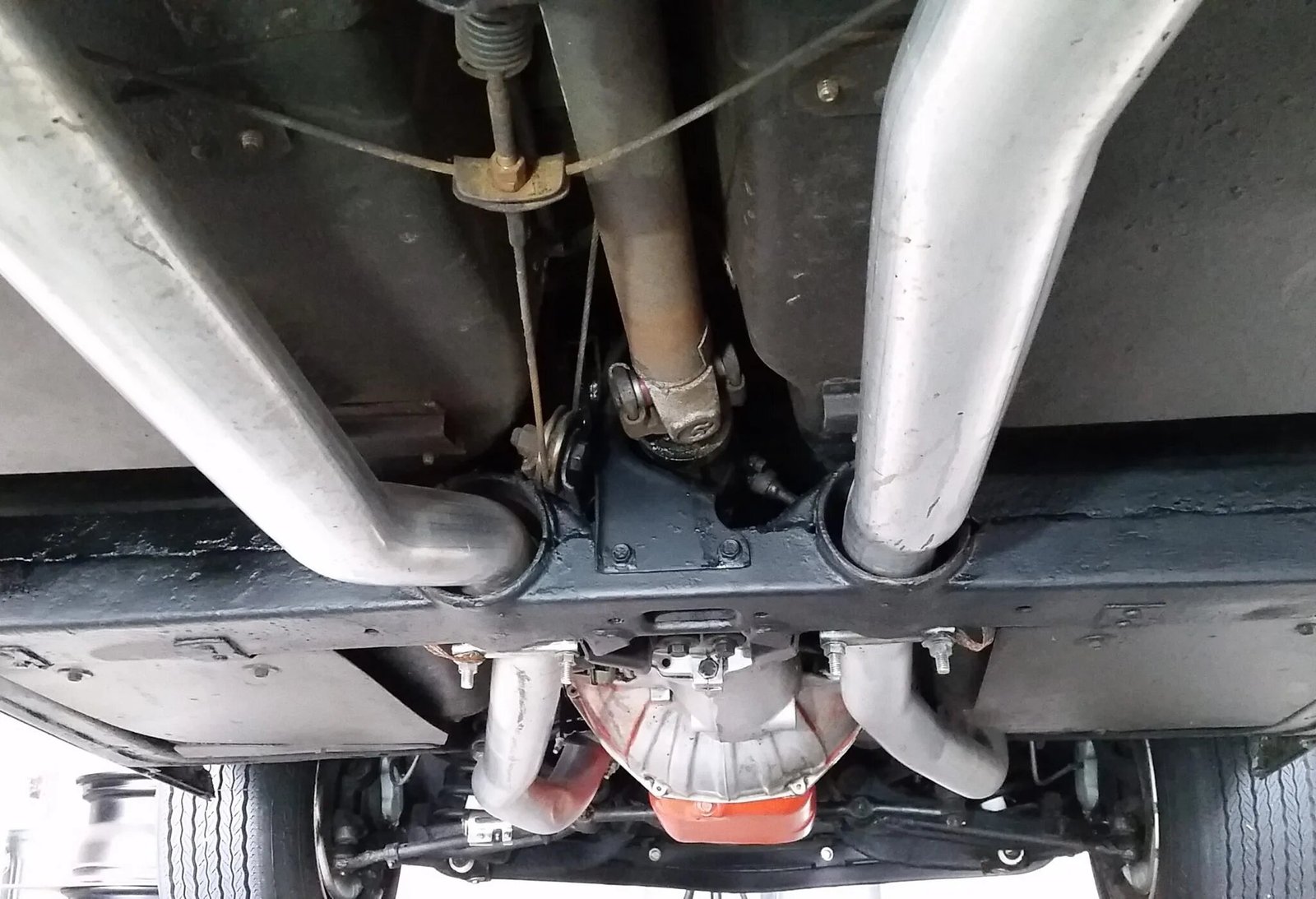 Silver 15″ Rally wheels wear polished trim rings and center caps and are wrapped with Firestone FR70-15 vintage-style redline tires that show 2020 date codes.