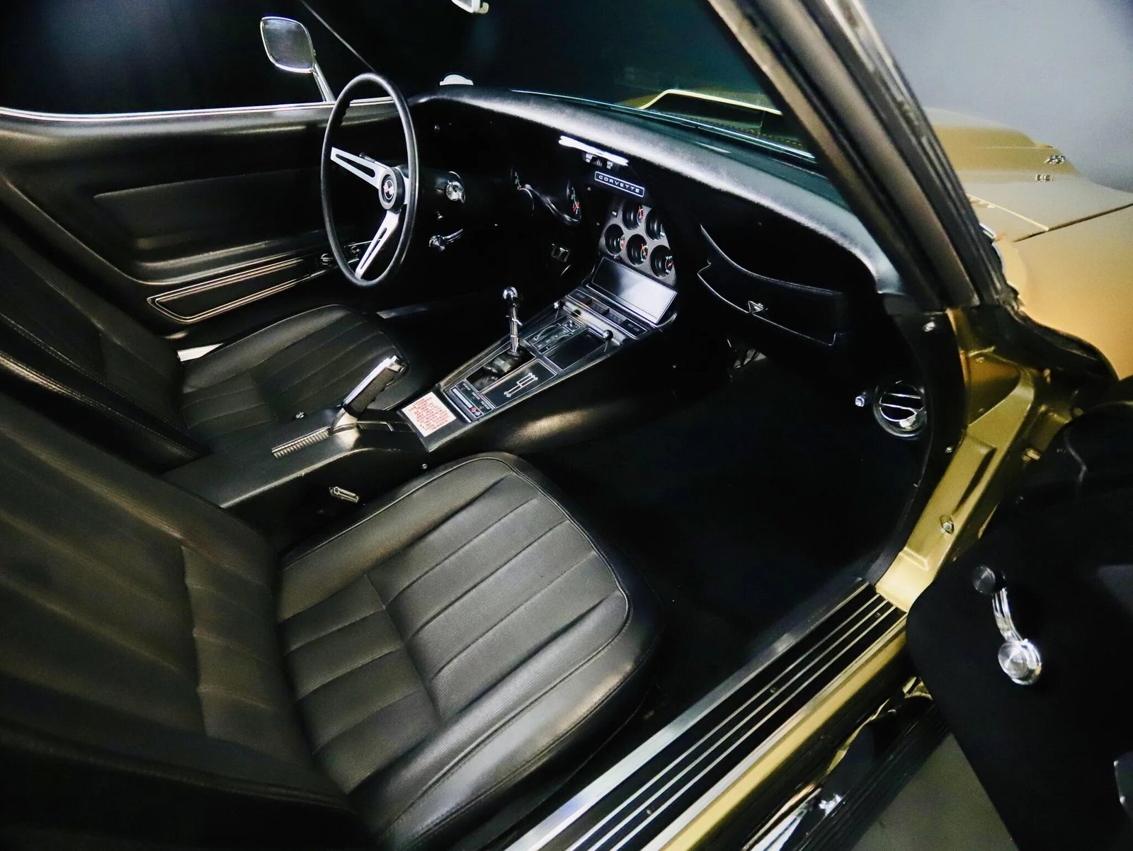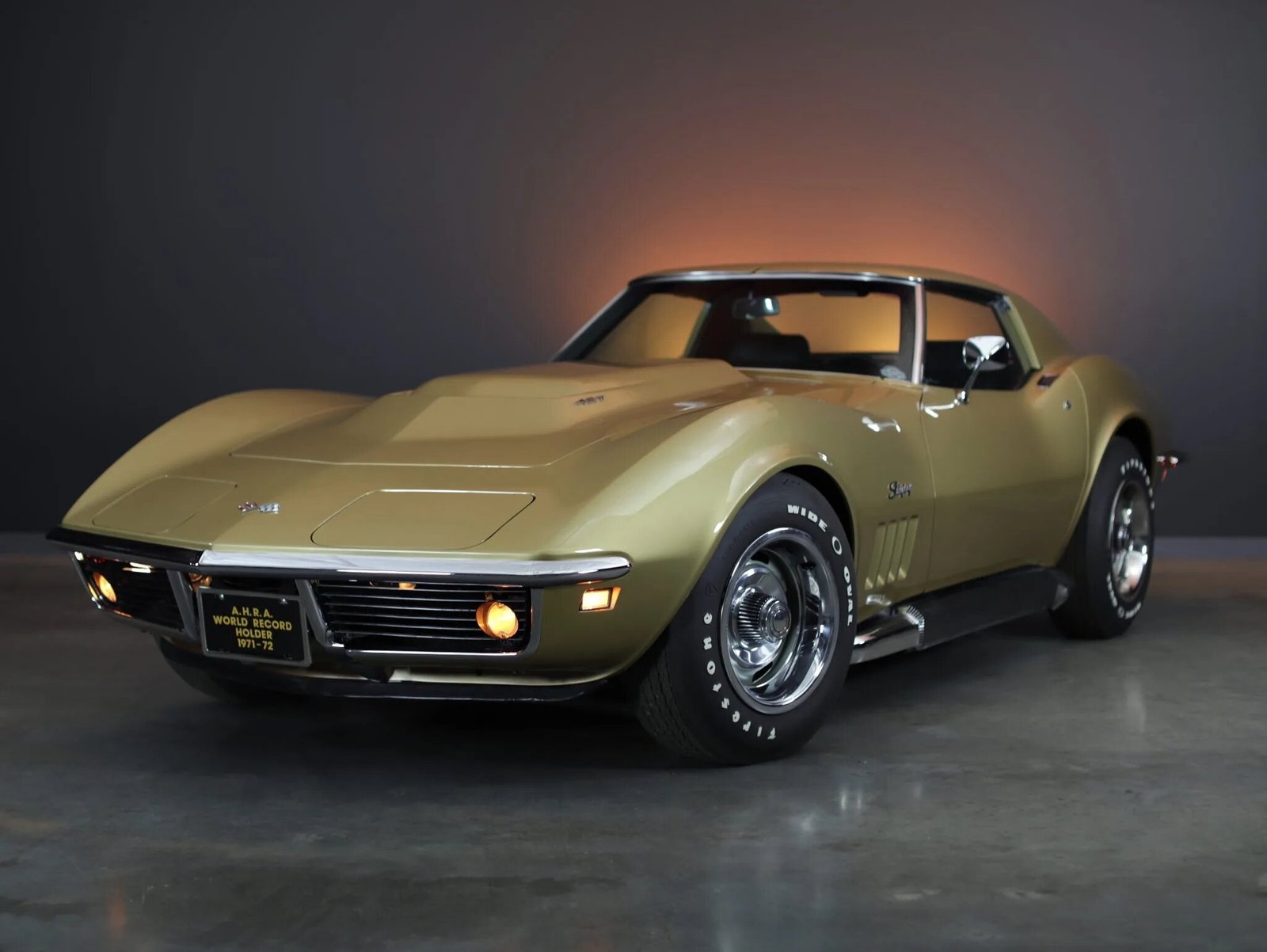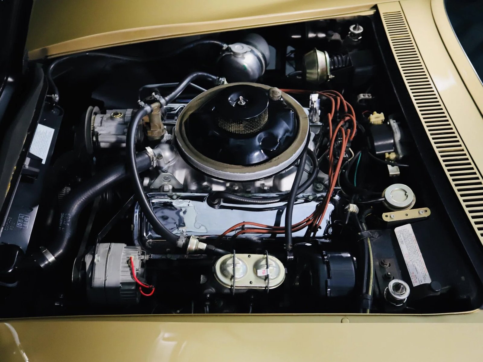 Exterior features include removable color-matched T-tops, “Stingray” fender badging, integrated backup lamps, and an L88-specific hood scoop with an integrated air plenum and higher clearance than that used on other 427-powered variants.
