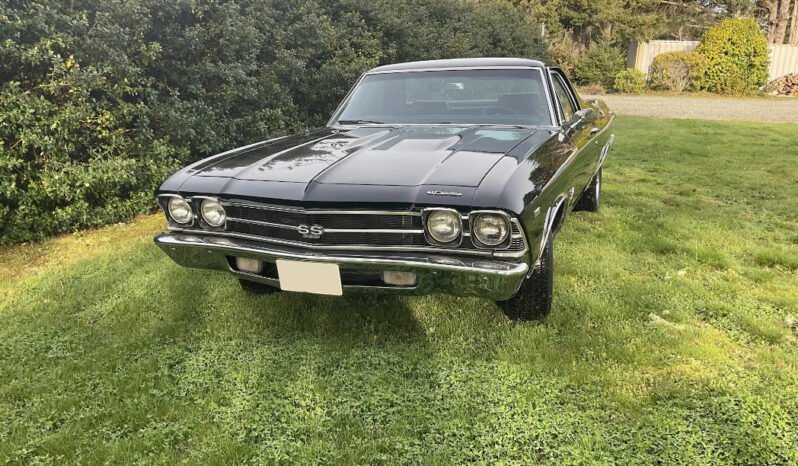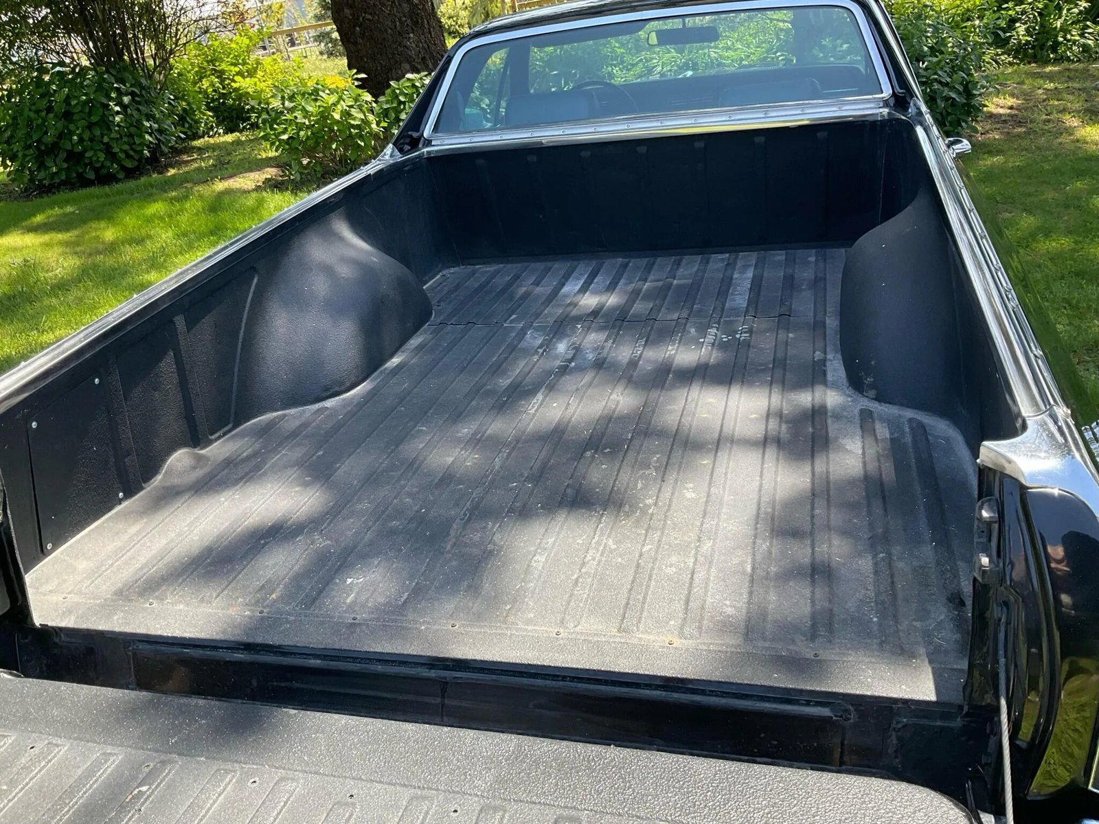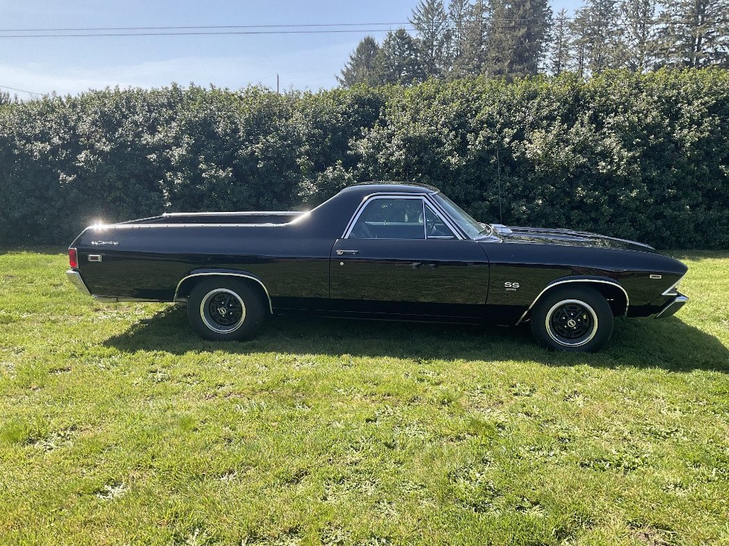 This 1969 Chevrolet El Camino is finished in black over black and powered by a replacement 396ci V8 paired with a Turbo 400 three-speed automatic transmission. Features include a FiTech fuel injection system, an Edelbrock intake manifold, an aluminum radiator, a dual exhaust system with Pypes mufflers, power steering, power front disc brakes, SS wheels, and a retro-style digital stereo.