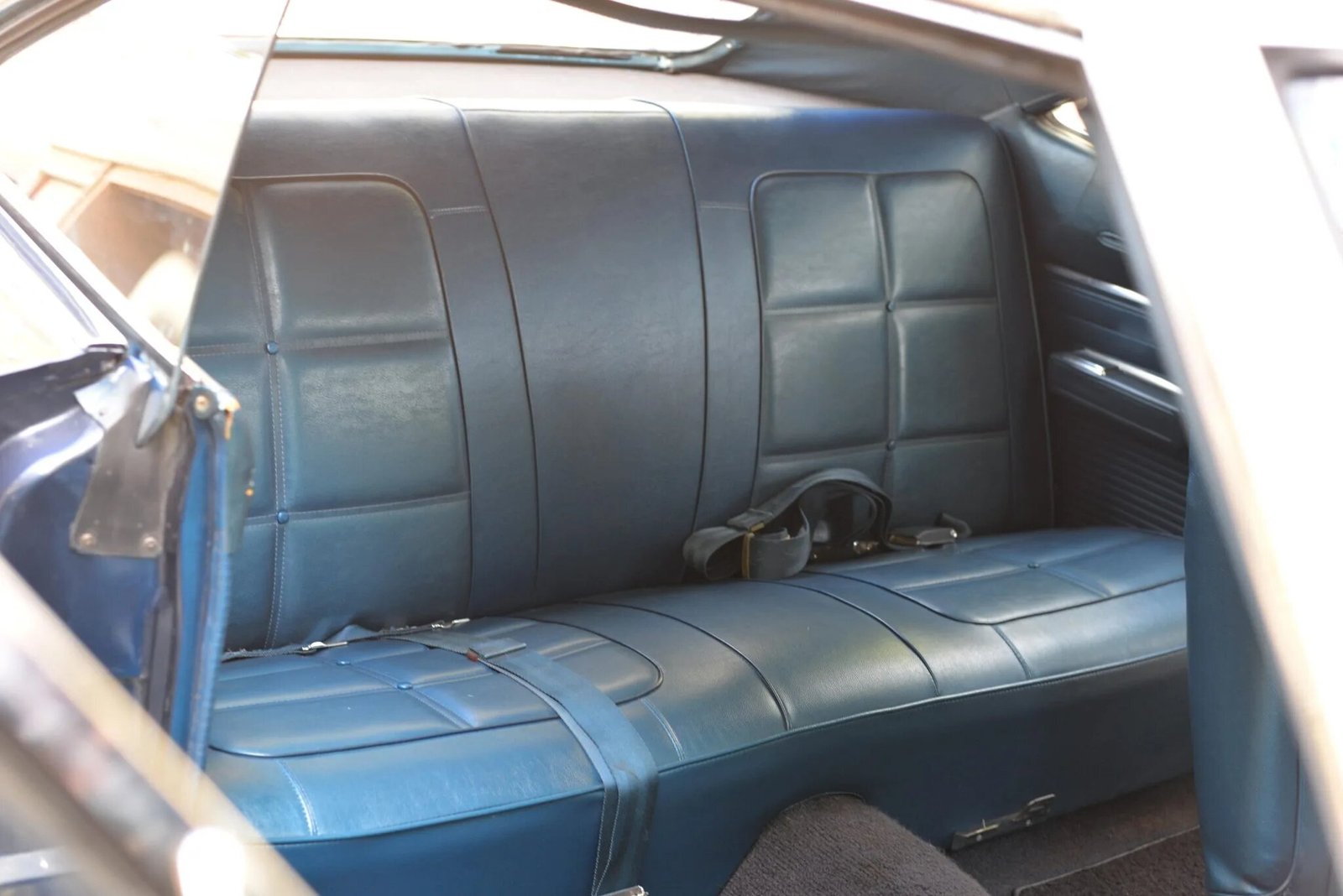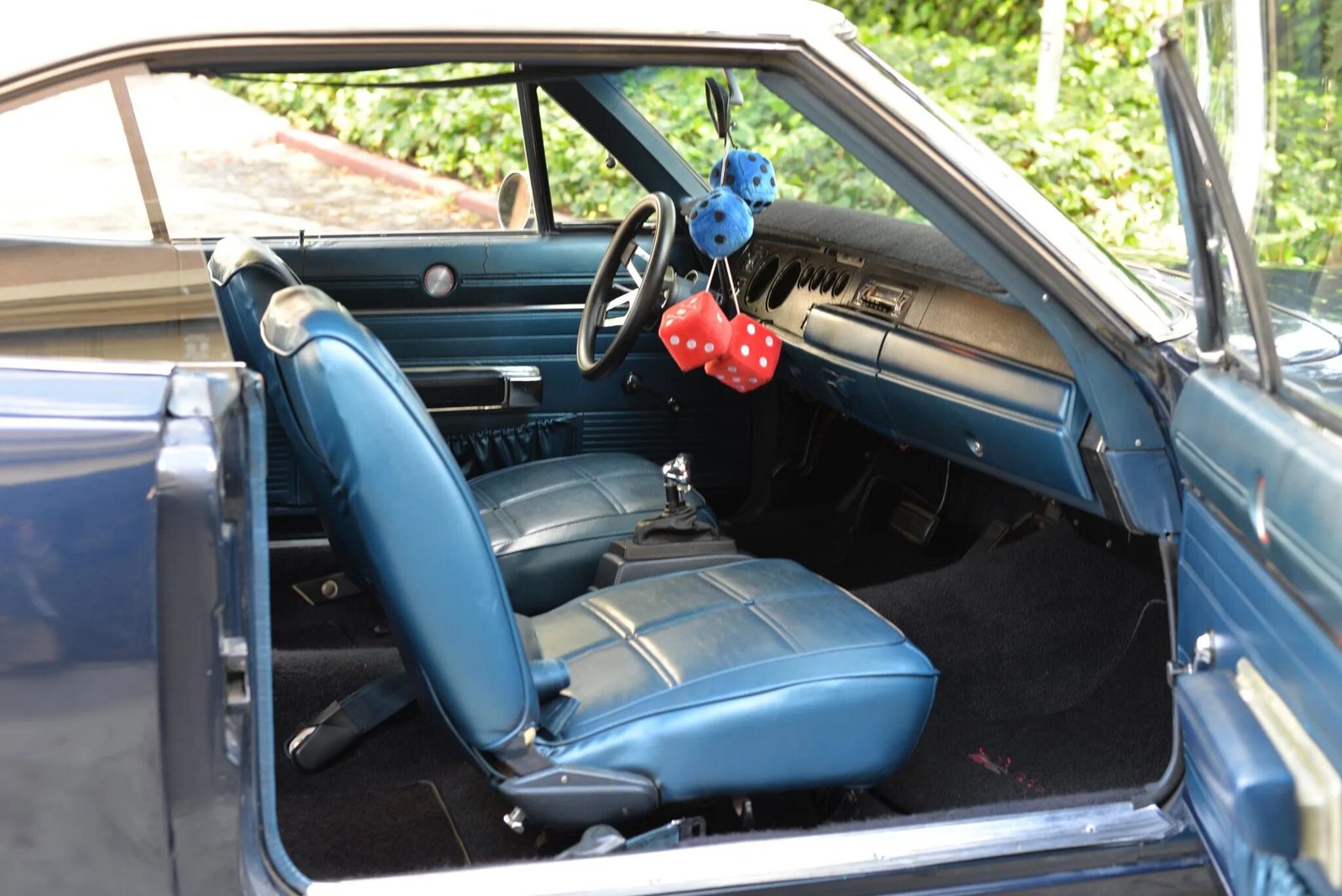 The interior is trimmed in blue vinyl with a matching dashboard and door panels.