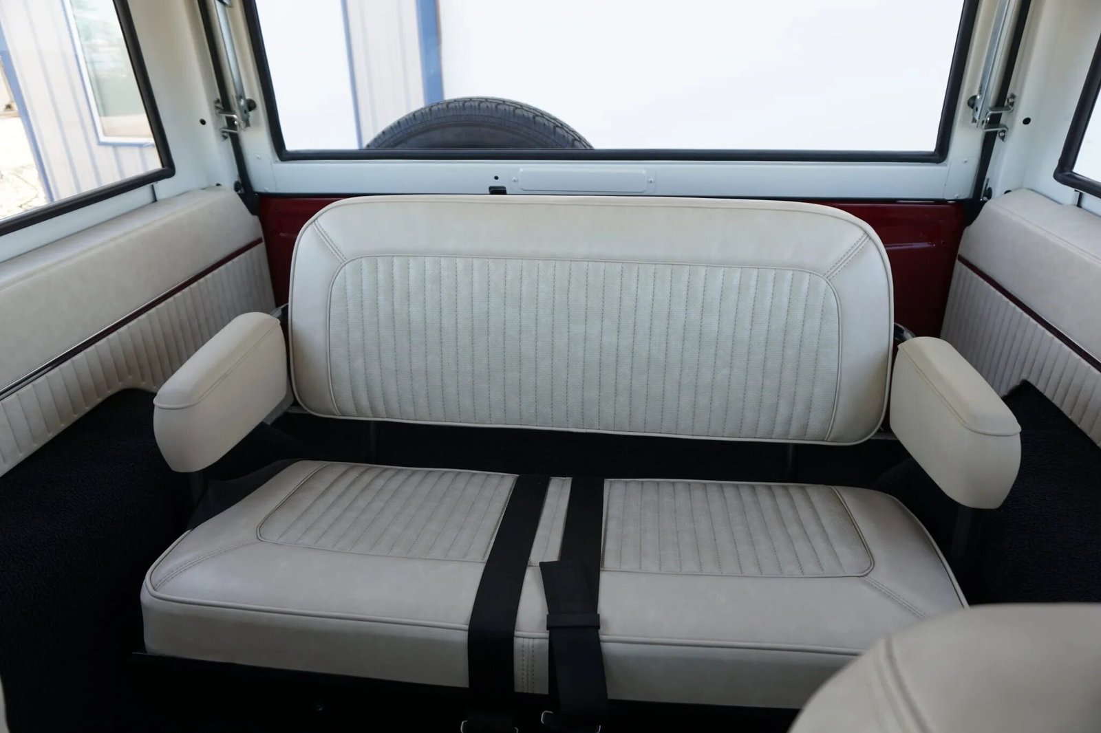 The cabin features front bucket seats and a rear bench trimmed in white vinyl with matching door panel inserts as well as black carpets and a black vinyl dashboard pad.