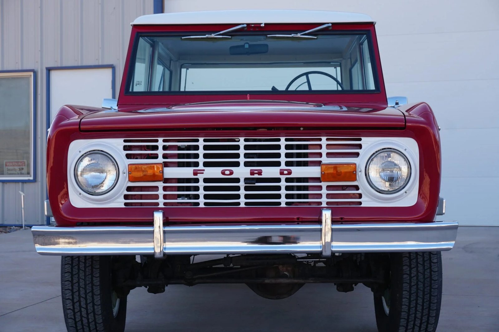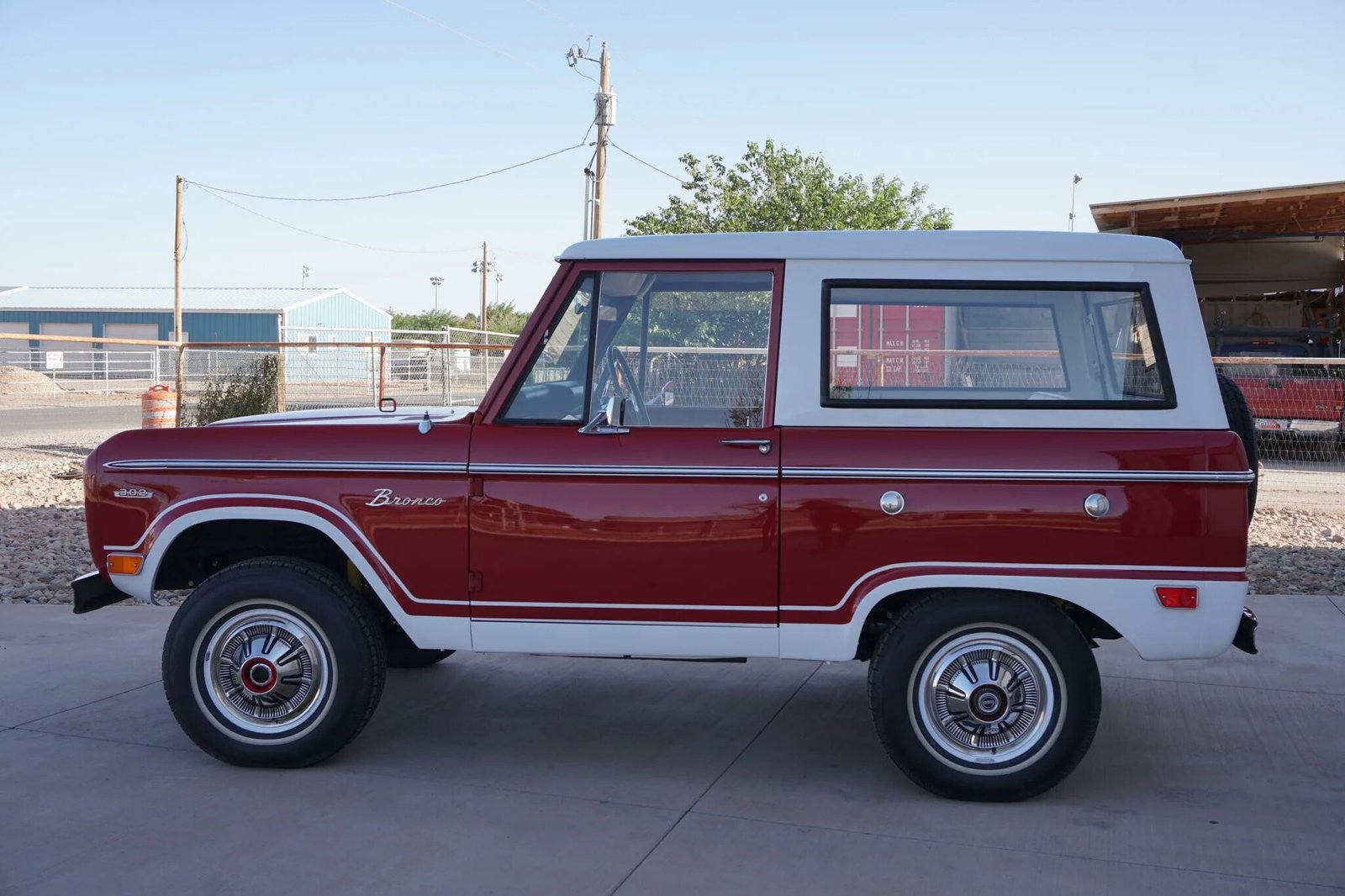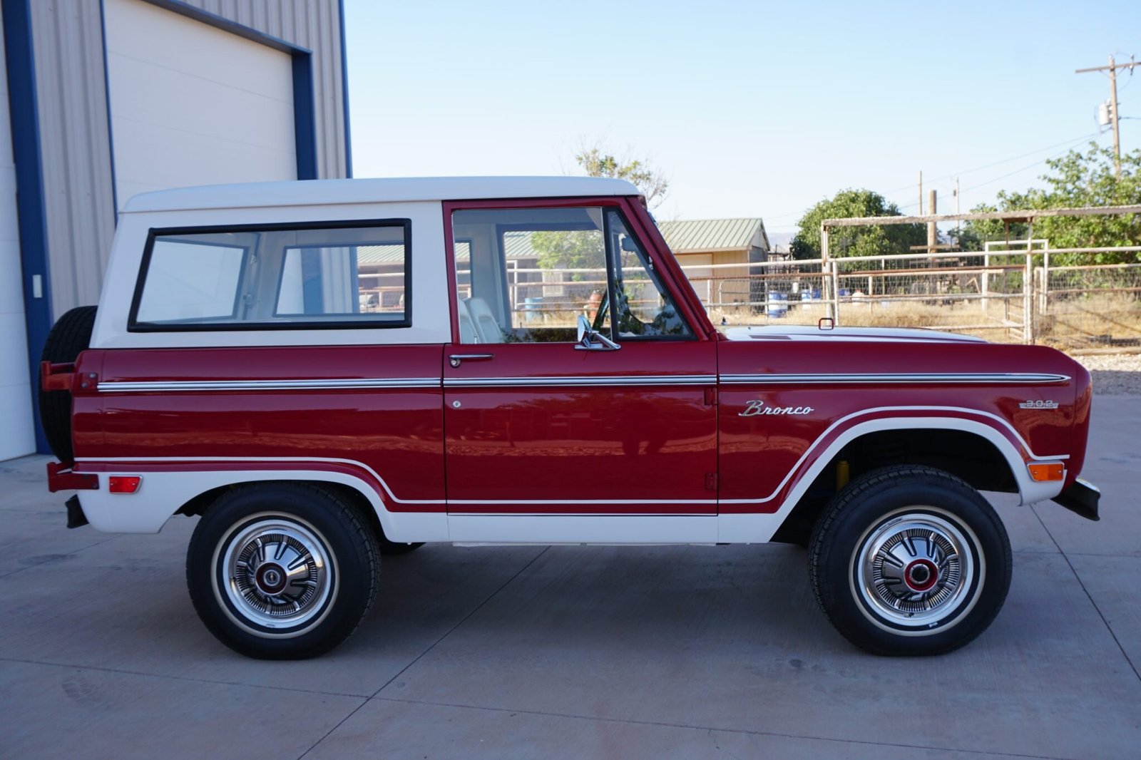 This 1969 Ford Bronco is finished in red over white vinyl upholstery and is powered by a 302ci V8 mated to a three-speed manual transmission and dual-range transfer case.