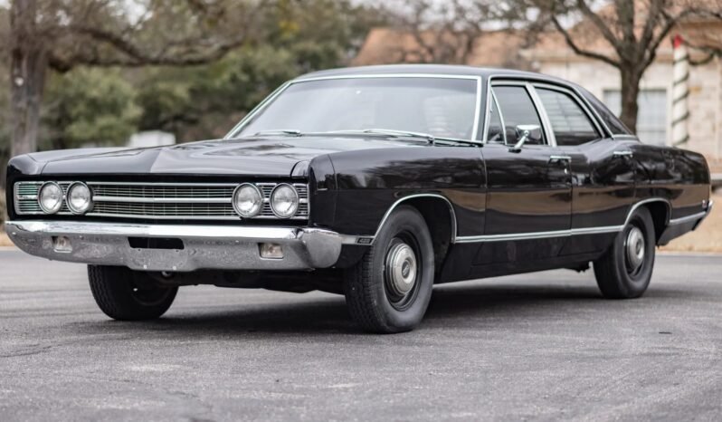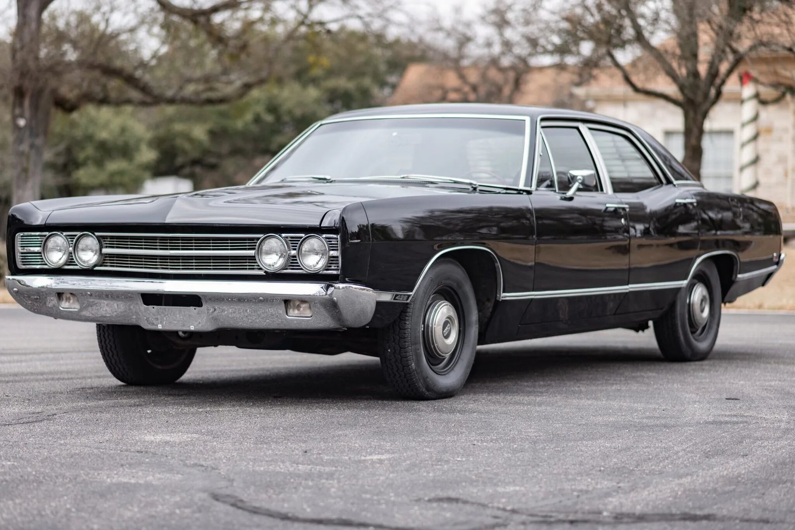 This 1969 Ford Galaxie 500 sedan is powered by a 429ci V8 paired with a four-speed manual transmission and is finished in black over red vinyl upholstery.