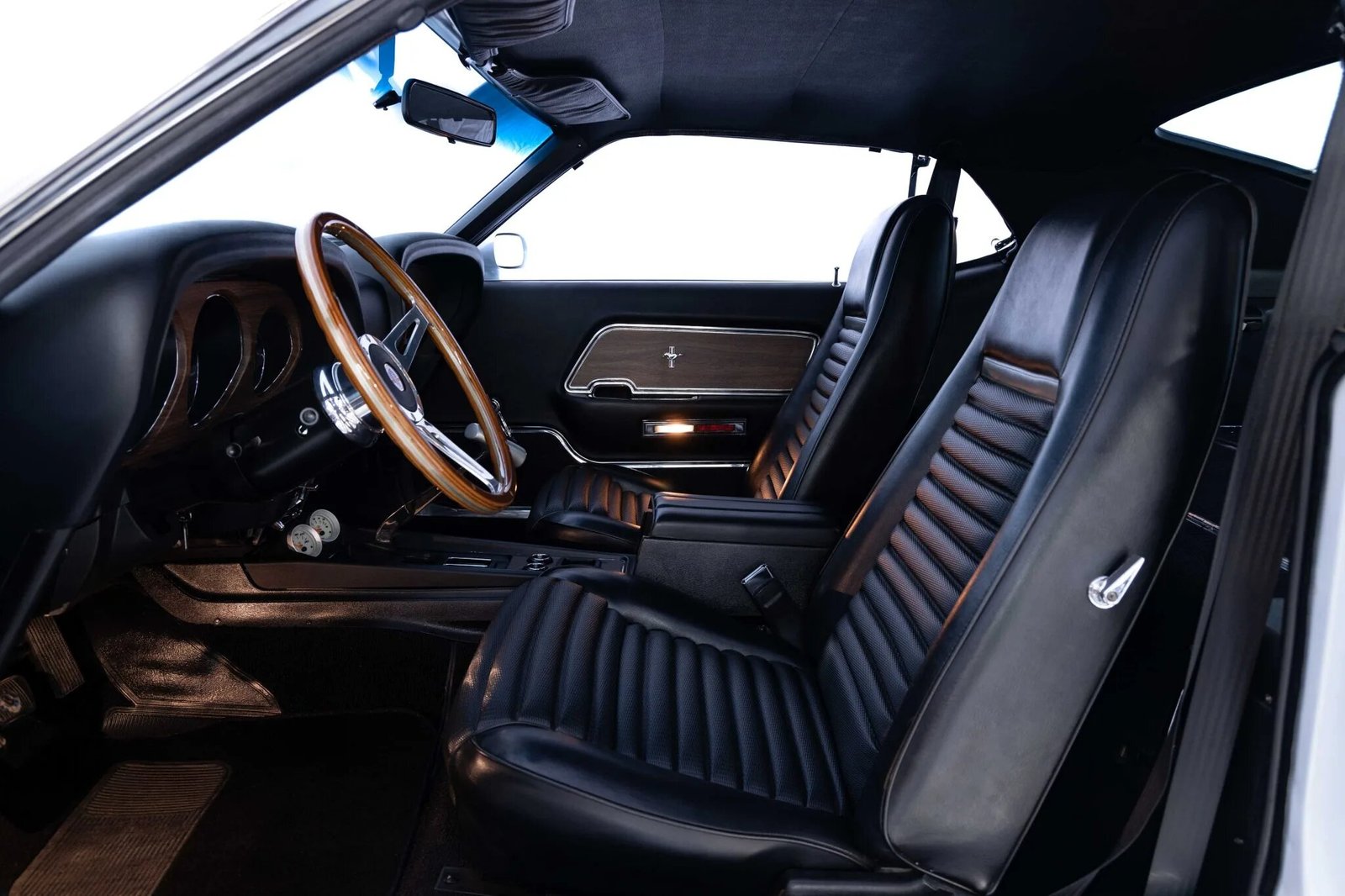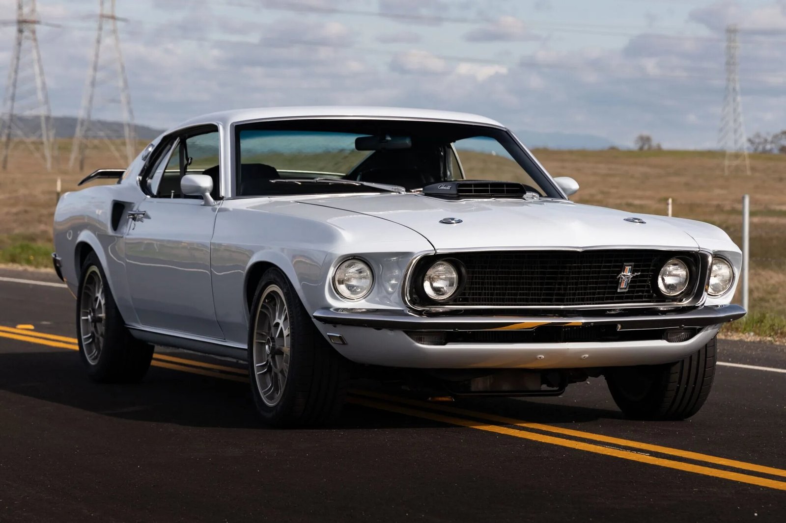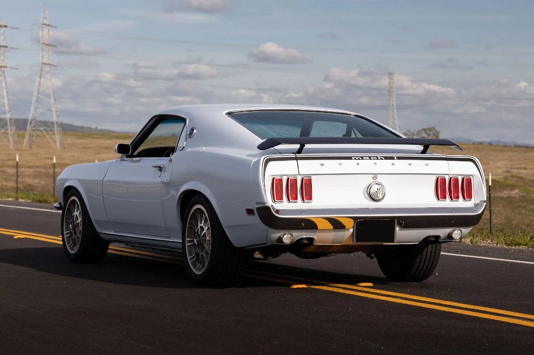 This 1969 Ford Mustang Mach 1 is powered by a replacement 428ci Cobra Jet V8 mated to a Tremec five-speed manual transmission and is finished in pastel blue over black vinyl upholstery. Equipment includes a Shaker hood, rear spoiler, 9-inch rear axle, Hurst shifter, JVC CD stereo, and grille with integrated fog lights as well as power four-wheel disc brakes, Koni shock absorbers, tubular front control arms, 18″ Shelby-style wheels, and Magnaflow mufflers.