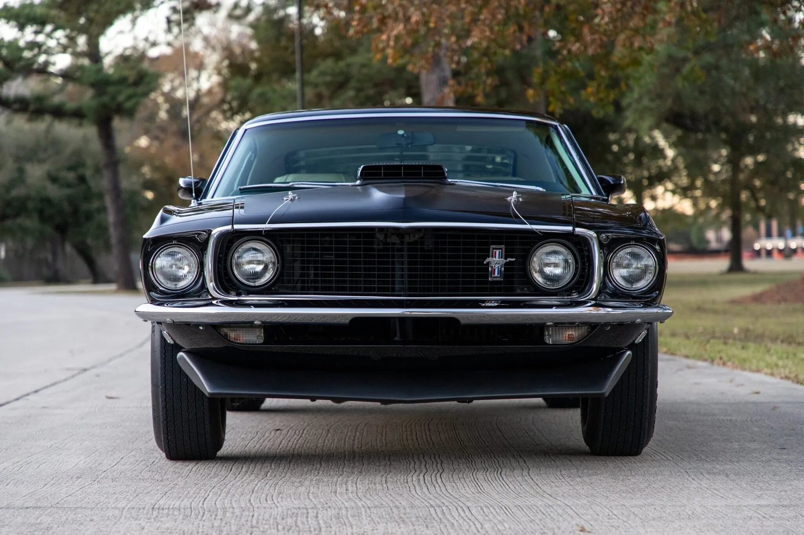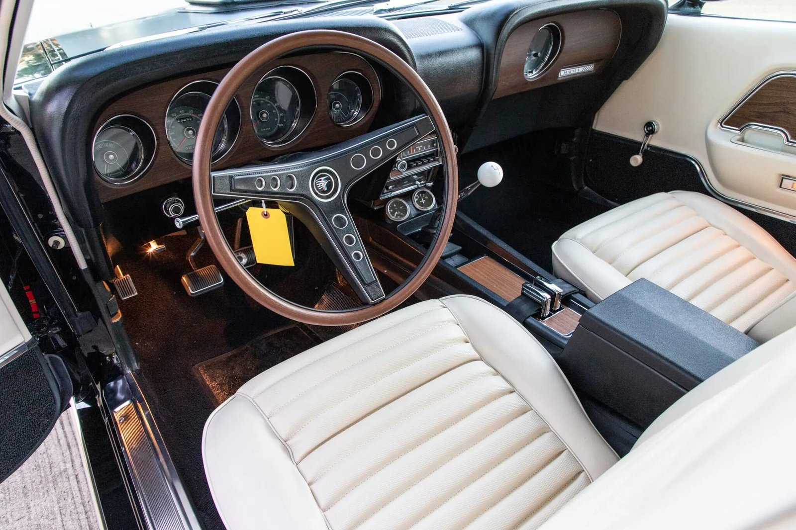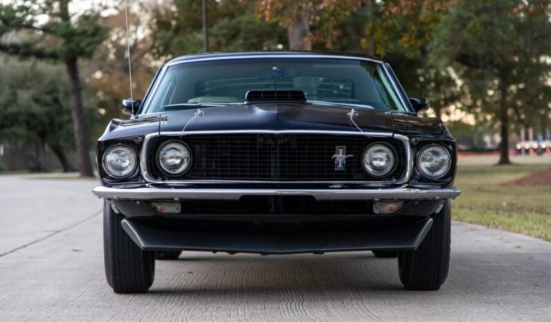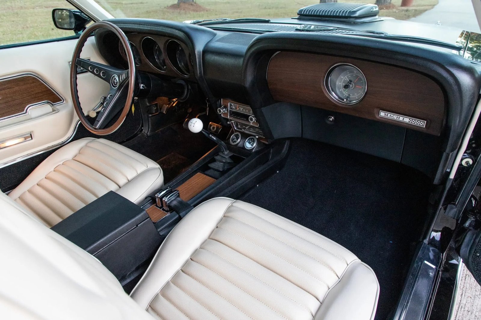 This 1969 Ford Mustang Mach 1 Sportsroof was the subject of a 3-year refurbishment. Work consisted of placing the body on a rotisserie, stripping and refinishing the body, reupholstering the interior, and overhauling the engine. The car is powered by a replacement 428ci Super Cobra Jet V8 linked to a four-speed manual transmission and a 4.30:1 Traction-Lok rear axle, and it is finished in black over white vinyl upholstery. Details include the Drag Pack option, a Shaker hood, a black-out hood treatment, a grille with integrated fog lights, front and rear spoilers, rear window louvers, red and yellow Mach 1 side stripes, power-assisted steering, power front disc brakes, 14″ Magnum 500-style wheels, a Hurst shifter, and a push-button AM radio.
