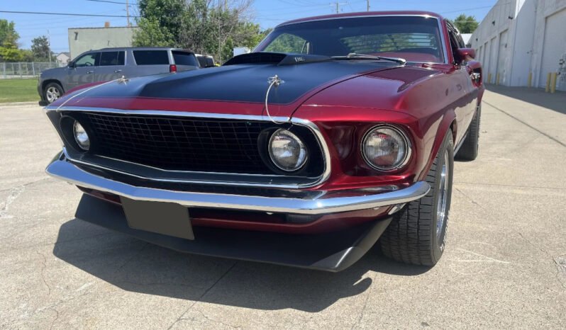 Features include a black hood with a scoop and hood pins, a front spoiler, dual side mirrors, Mach 1 side graphics, chrome bumpers and rocker panel trim, rear window louvers, and a rear wing.