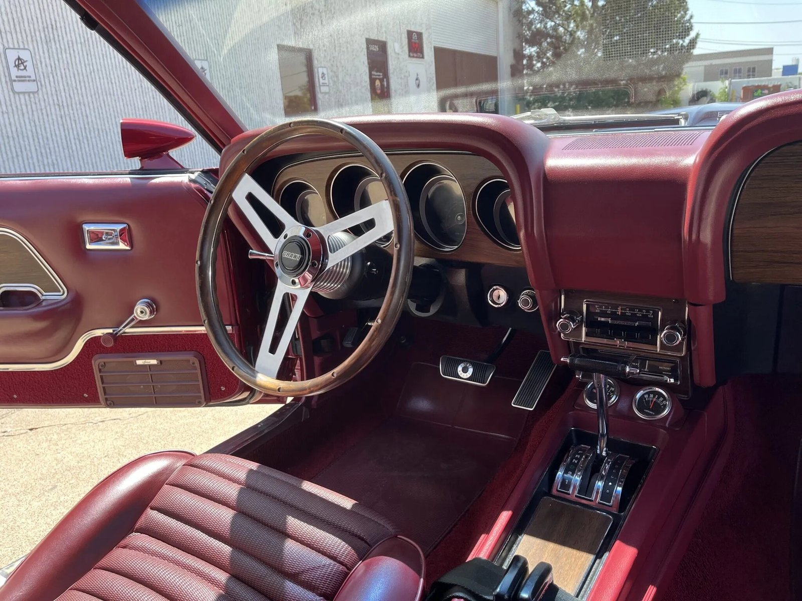 The three-spoke Grant steering wheel frames a 120-mph speedometer, a tachometer, and a fuel-level gauge, while auxiliary gauges are mounted ahead of the shifter.