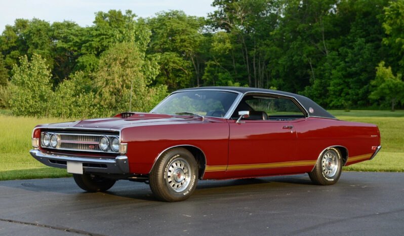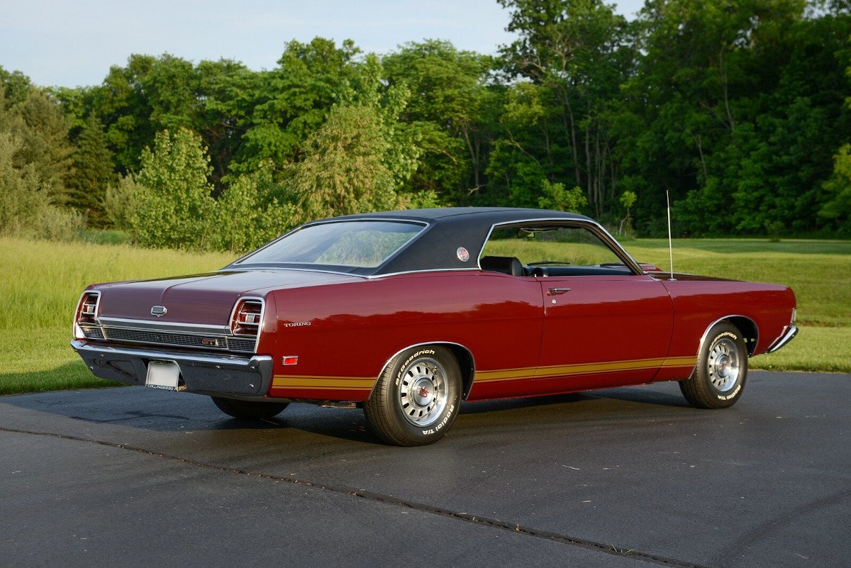 This 1969 Ford Torino GT is finished in Royal Maroon, factory options include a 351ci V8, select-shift Cruise-O-Matic transmission, Traction Lok differential, vinyl roof, an electric clock, adjustable front headrests, and an AM radio.