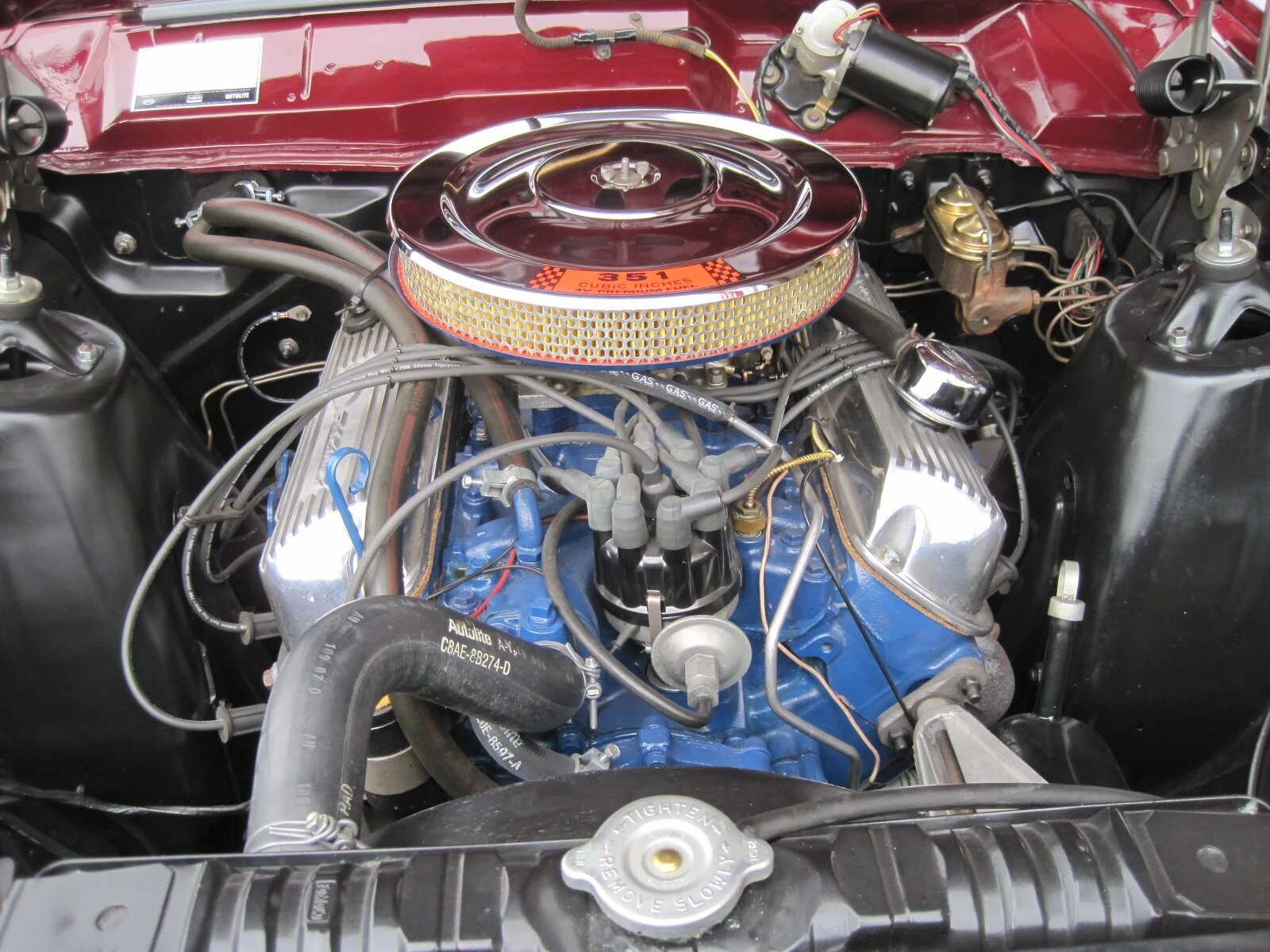 The 351ci V8 was rebuilt in 2007 and modified with an Edelbrock 4-barrel carburetor, Ford intake manifold, competition camshaft, 10:1 compression pistons, and a dual exhaust system.