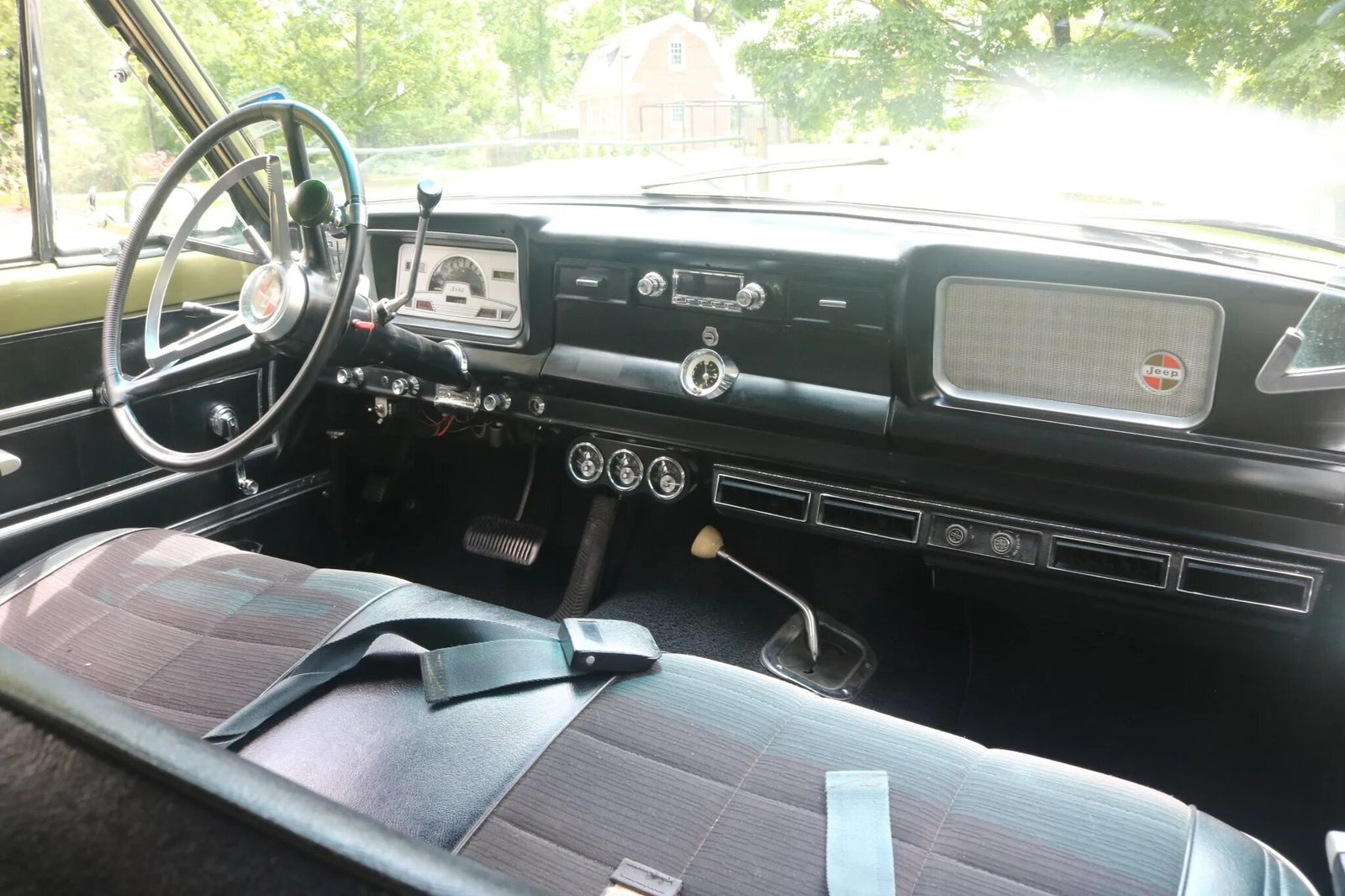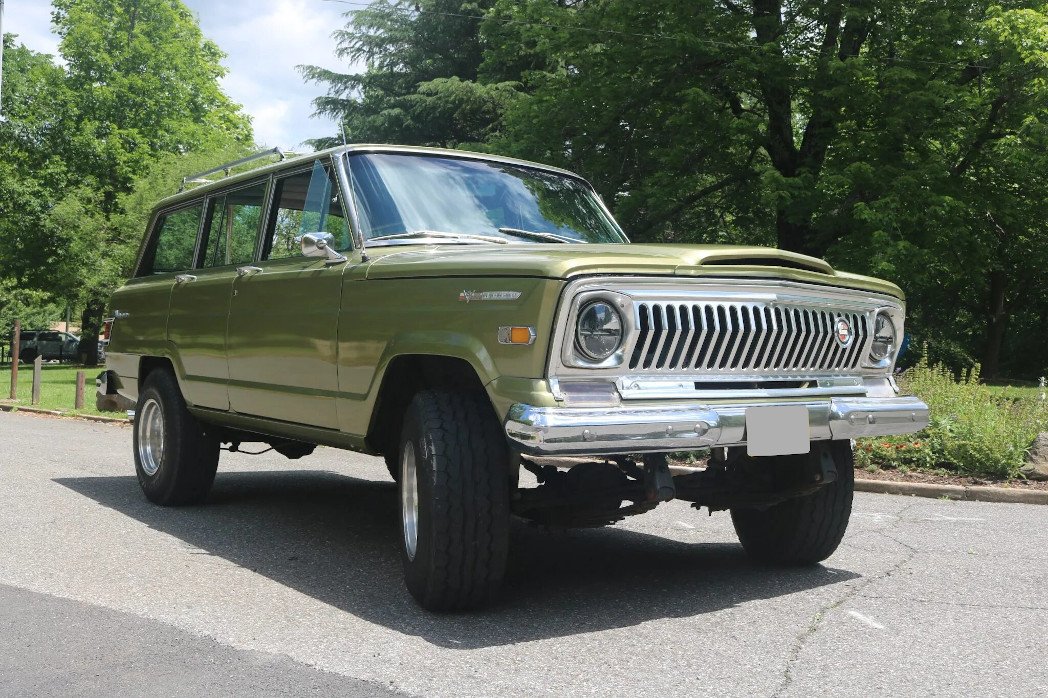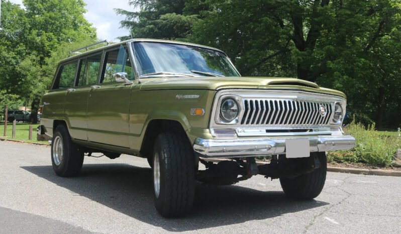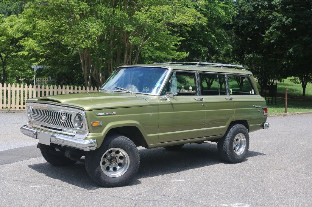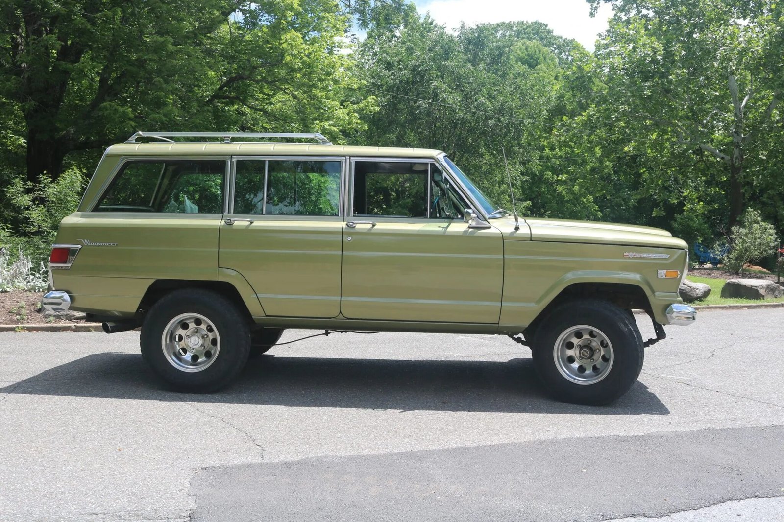 This 1969 Jeep Wagoneer is powered by a 350ci Dauntless V8 mated to a three-speed automatic transmission and a dual-range transfer case and is finished in metallic green over a black interior.