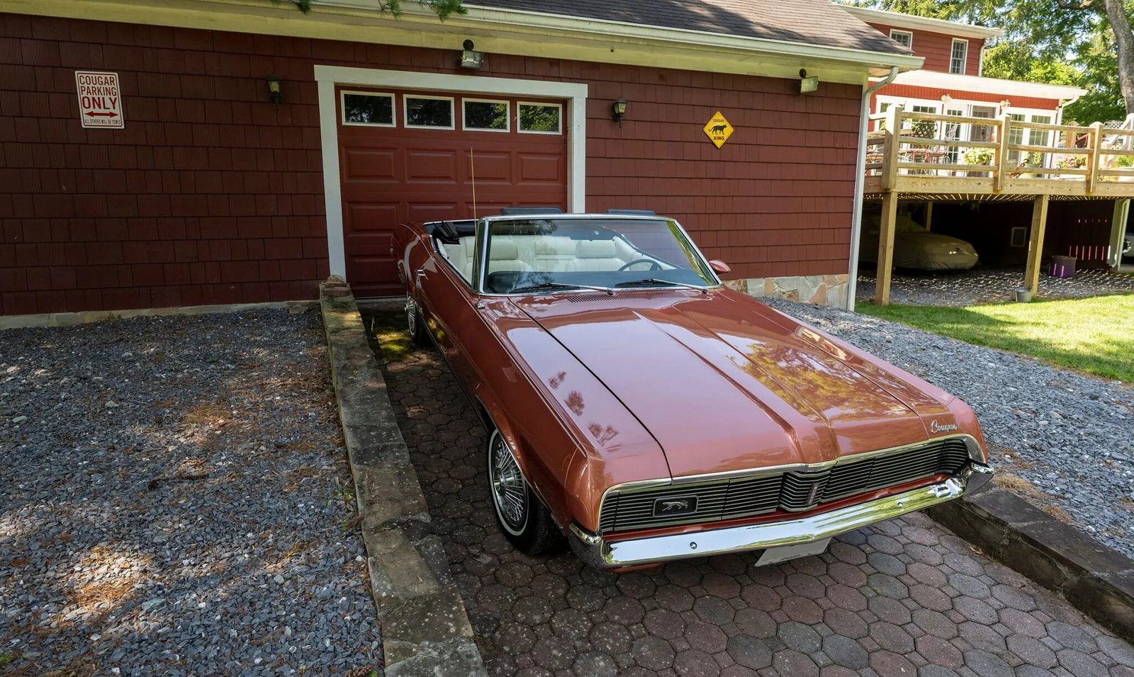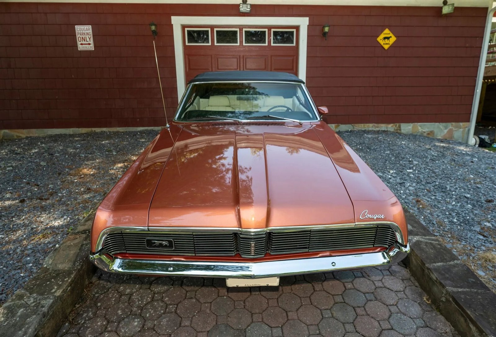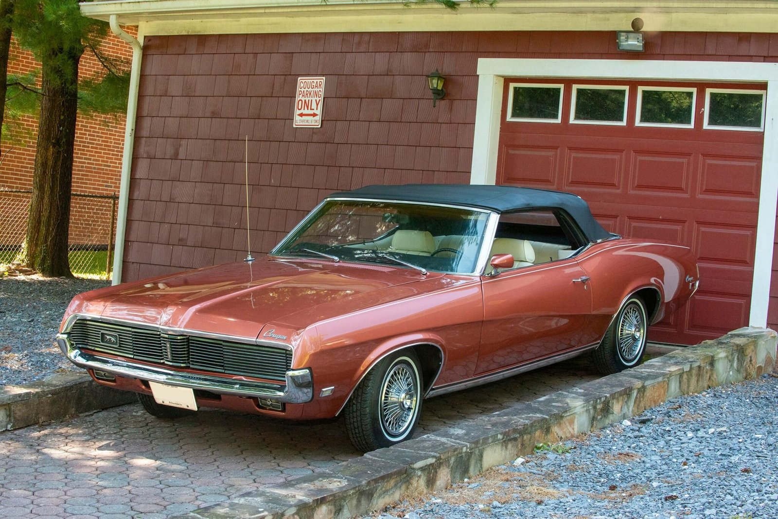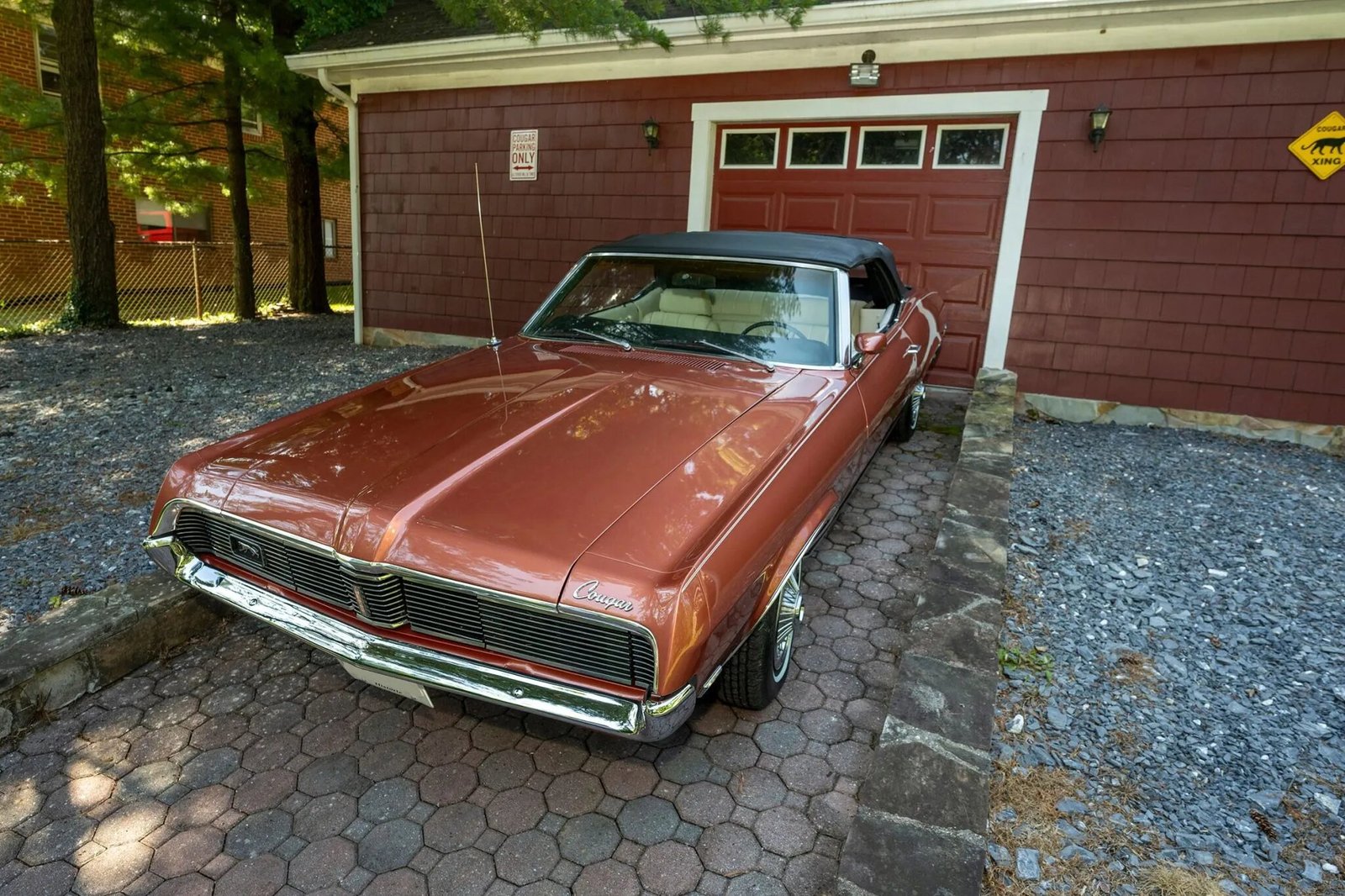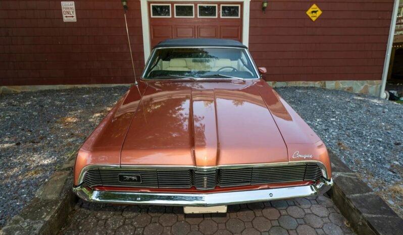 This 1969 Mercury Cougar XR-7 convertible is finished in Burnt Orange Metallic over white leather and power is provided by a 351ci V8 paired with a three-speed FMX Select-Shift automatic transmission. Equipment includes a black soft top, hideaway headlight covers, sequential turn signals, an AM/FM radio, bucket seats, power steering, tubular headers, and a dual exhaust system.