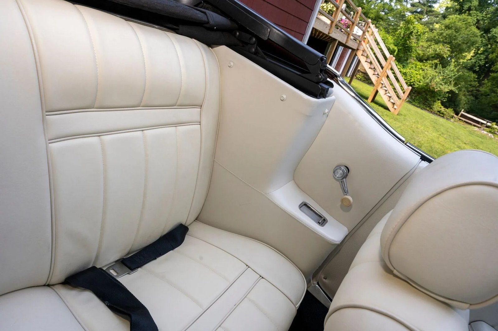The cabin features front bucket seats and a rear bench that have been reupholstered in white leather along with woodgrain trim accenting the contrasting black dashboard.