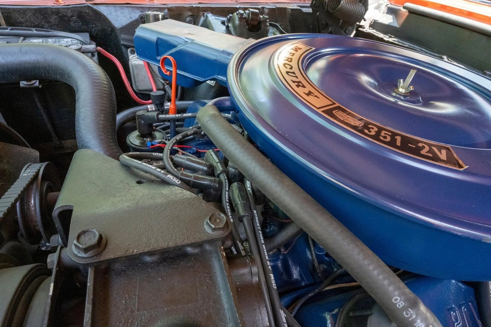 The 351ci V8 is equipped with a four-barrel carburetor, electronic ignition, tubular headers, and a dual exhaust system.